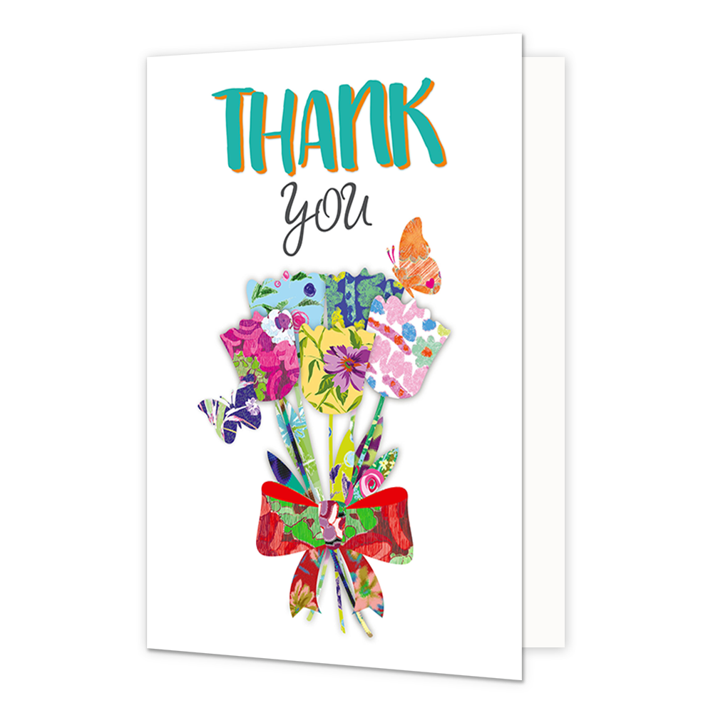 De wenskaart heeft een afmeting van x en een staande vorm. Op deze wenskaart staat een boeket bloemen met daarboven de tekst: "Thank you". De binnenzijde van de wenskaart is blanco wat voldoende ruimte geeft om een persoonlijke boodschap te schrijven .