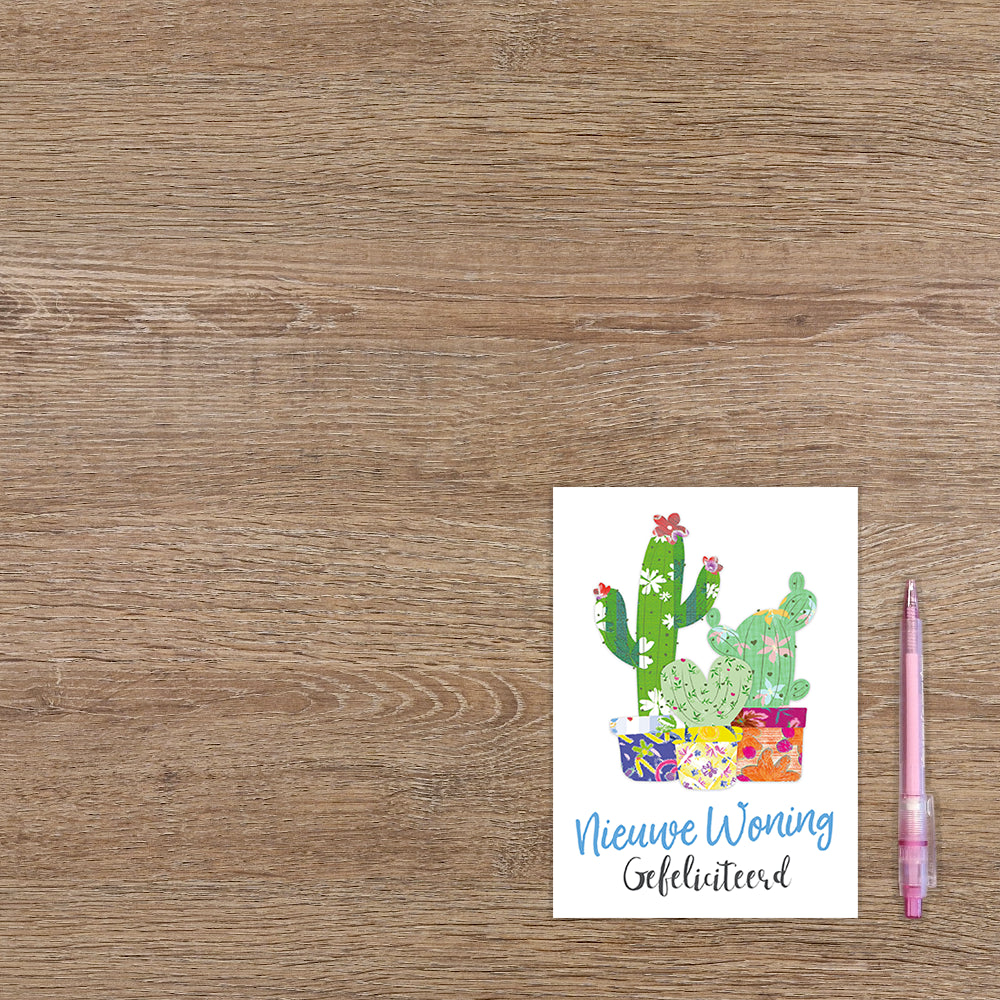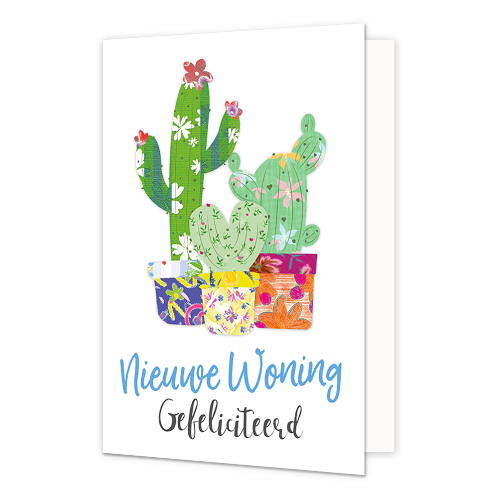 De wenskaart heeft een afmeting van x en een staande vorm. Op deze wenskaart staan drie cactussen in vasen met daaronder de tekst: "Nieuwe woning gefeliciteerd". De binnenzijde van de wenskaart is blanco wat voldoende ruimte geeft om een persoonlijke boodschap te schrijven .