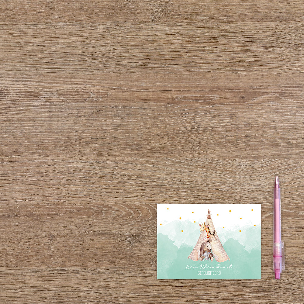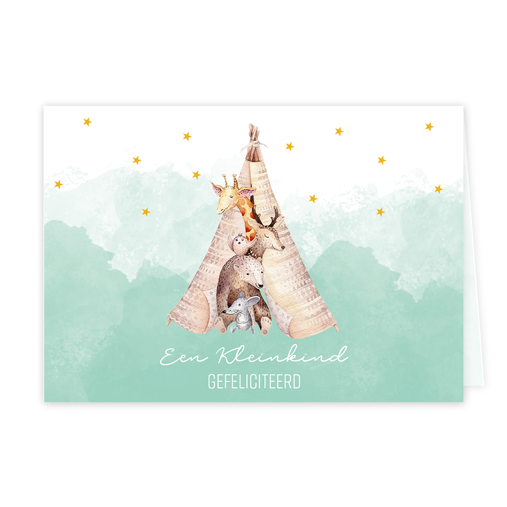 De wenskaart heeft een afmeting van x en een liggende vorm. Op deze wenskaart staan dieren die uit een tipitent kijken met daaronder de tekst: "Een kleinkind gefeliciteerd". De binnenzijde van de wenskaart is bedrukt met een ontwerp passend bij de voorzijde van de kaart .