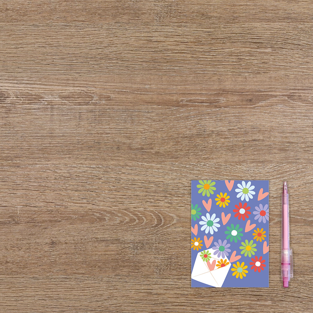 De wenskaart heeft een afmeting van x en een liggende vorm. Op deze wenskaart staan bloemen en hartjes die uit een envelop komen in de kleuren rood, oranje, blauw, green, geel en paars. De binnenzijde van de wenskaart is bedrukt met een ontwerp passend bij de voorzijde van de kaart .