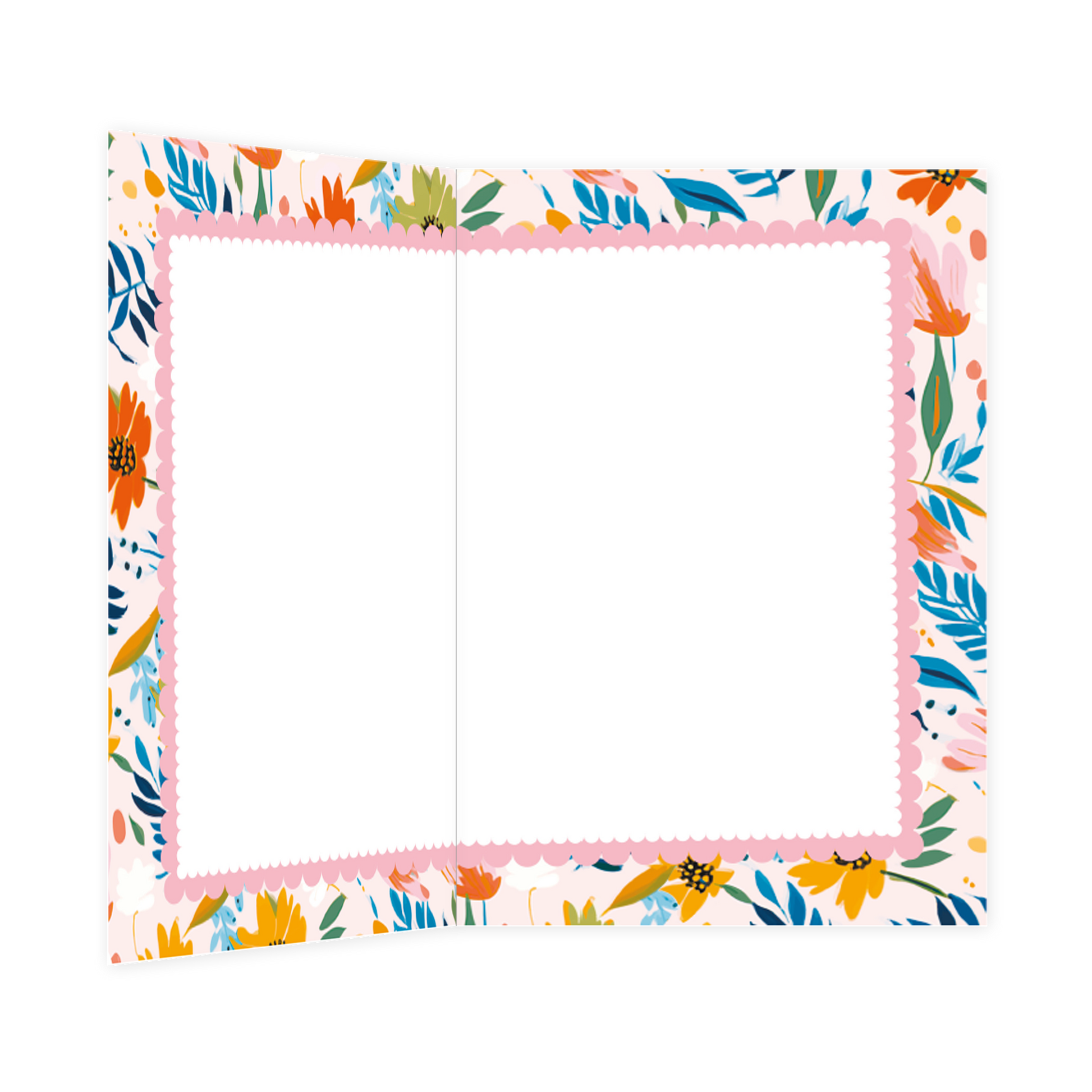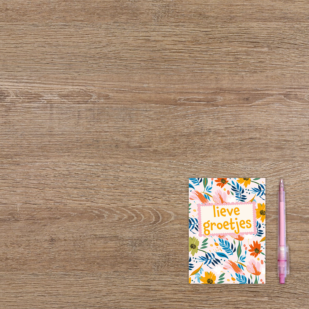 De wenskaart heeft een afmeting van x en een staande vorm. Op deze wenskaart staan bloemen en bladeren in de kleuren blauw, groen, roze, oranje en geel. In het midden staat de tekst: "Lieve groetjes". De binnenzijde van de wenskaart is bedrukt met een ontwerp passend bij de voorzijde van de kaart .