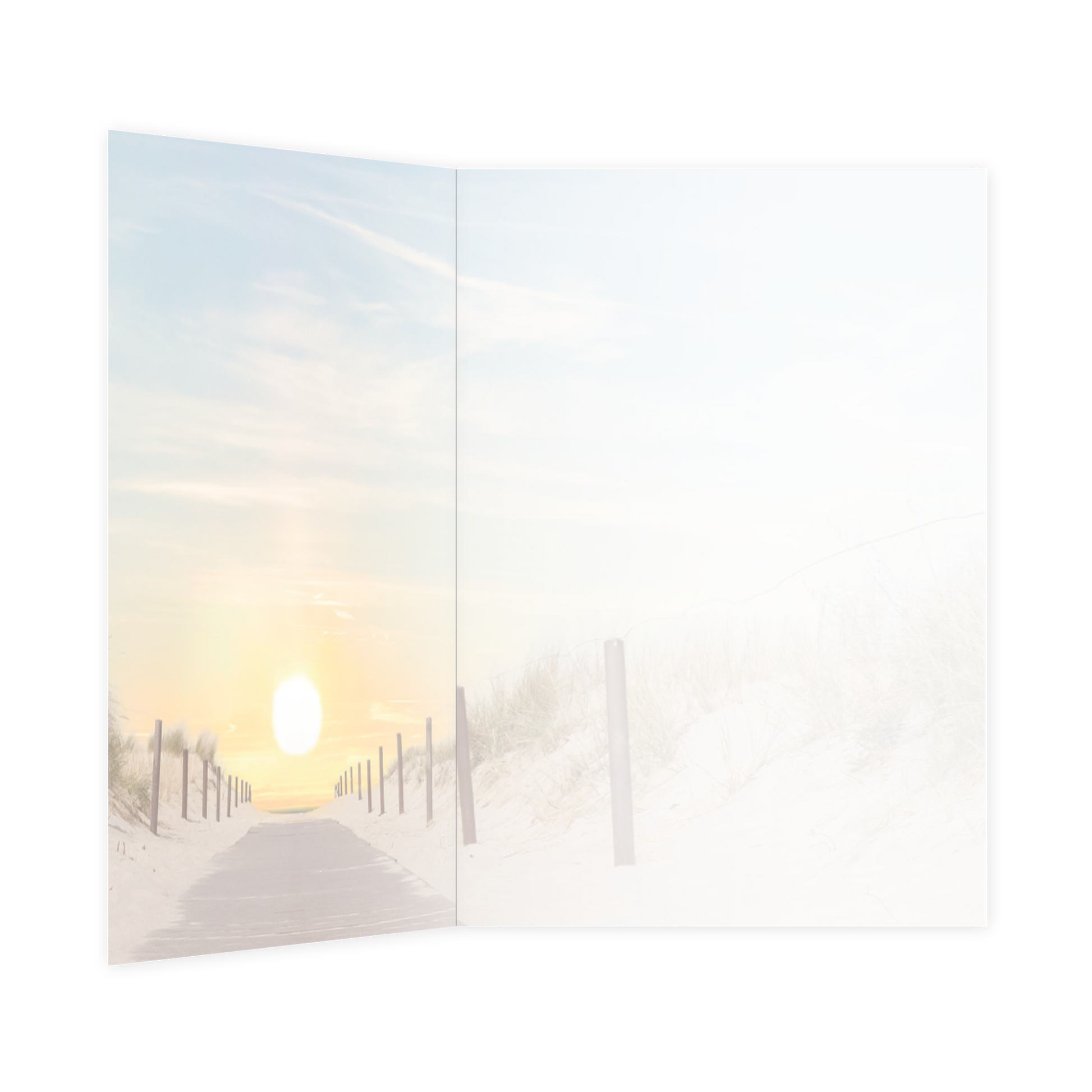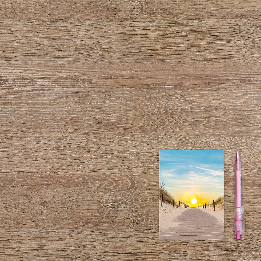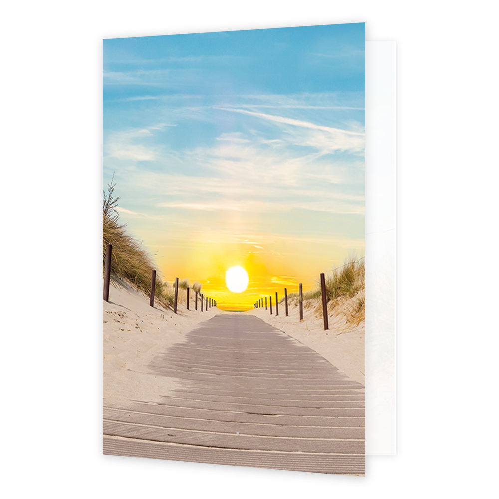 De wenskaart heeft een afmeting van x en een staande vorm. Op deze wenskaart staat een duinpad dat richting de zee loopt met een ondergaande zon. De binnenzijde van de wenskaart is bedrukt met een ontwerp passend bij de voorzijde van de kaart .