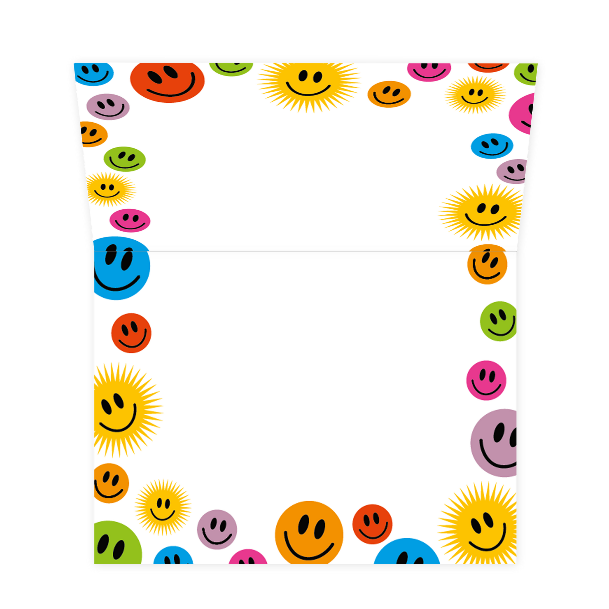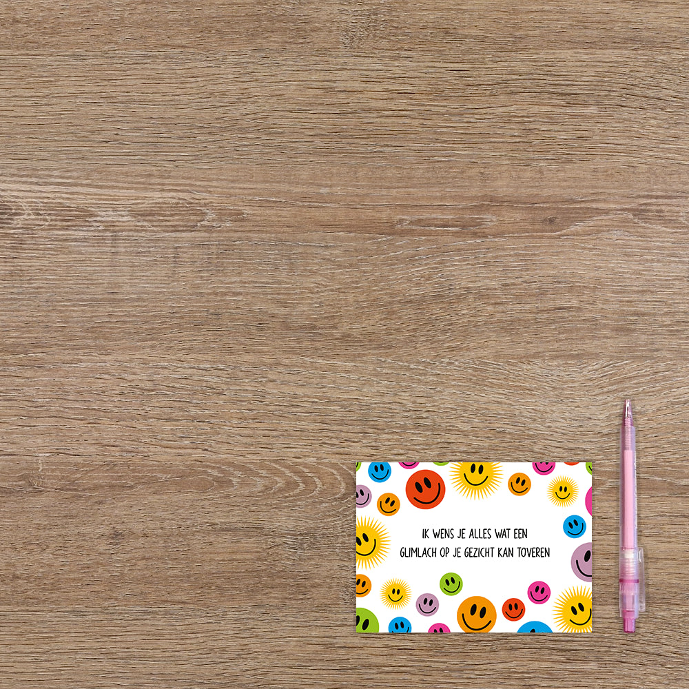 De wenskaart heeft een afmeting van x en een liggende vorm. Op deze wenskaart staan smiley in diverse kleuren met in het midden de tekst: "Ik wens je alles wat een glimlach op je gezicht kan toveren". De binnenzijde van de wenskaart is bedrukt met een ontwerp passend bij de voorzijde van de kaart .