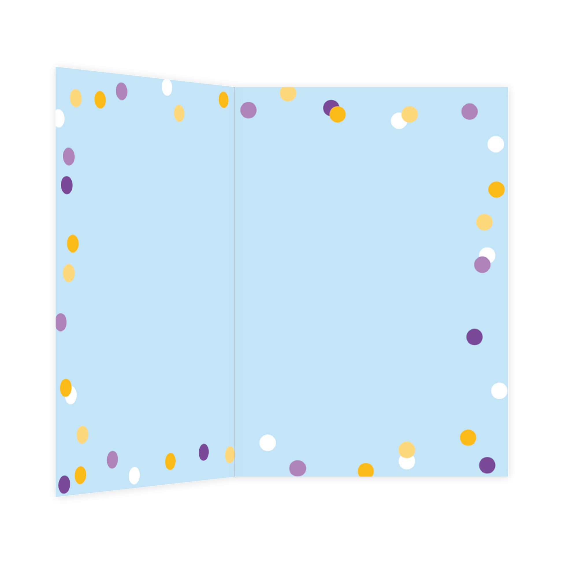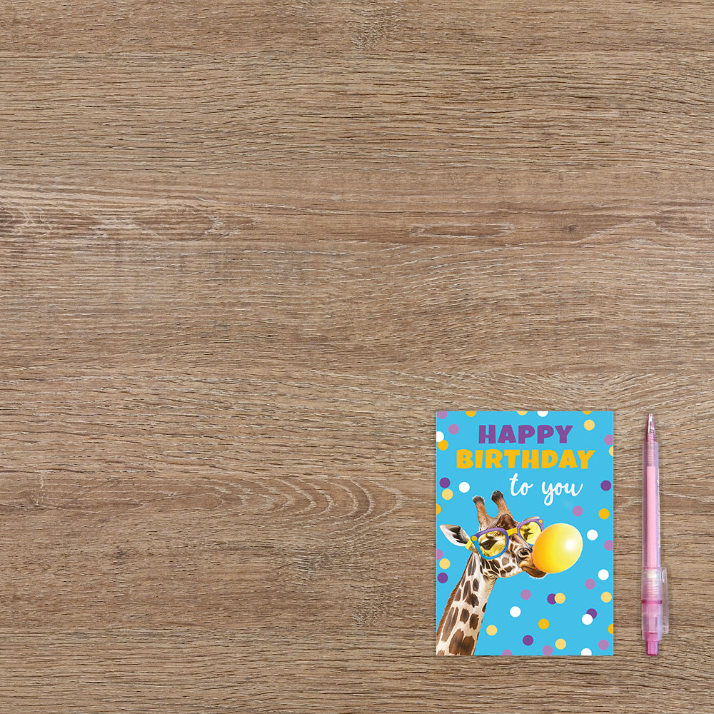De wenskaart heeft een afmeting van x en een staande vorm. Op deze wenskaart is een giraffe te zien die een gele balon opblaast op een blauwe achtergrond met stippen in de kleuren paars, geel en wit. Boven de giraffe staat de tekst: "Happy birthday to you". De binnenzijde van de wenskaart is bedrukt met een ontwerp passend bij de voorzijde van de kaart .