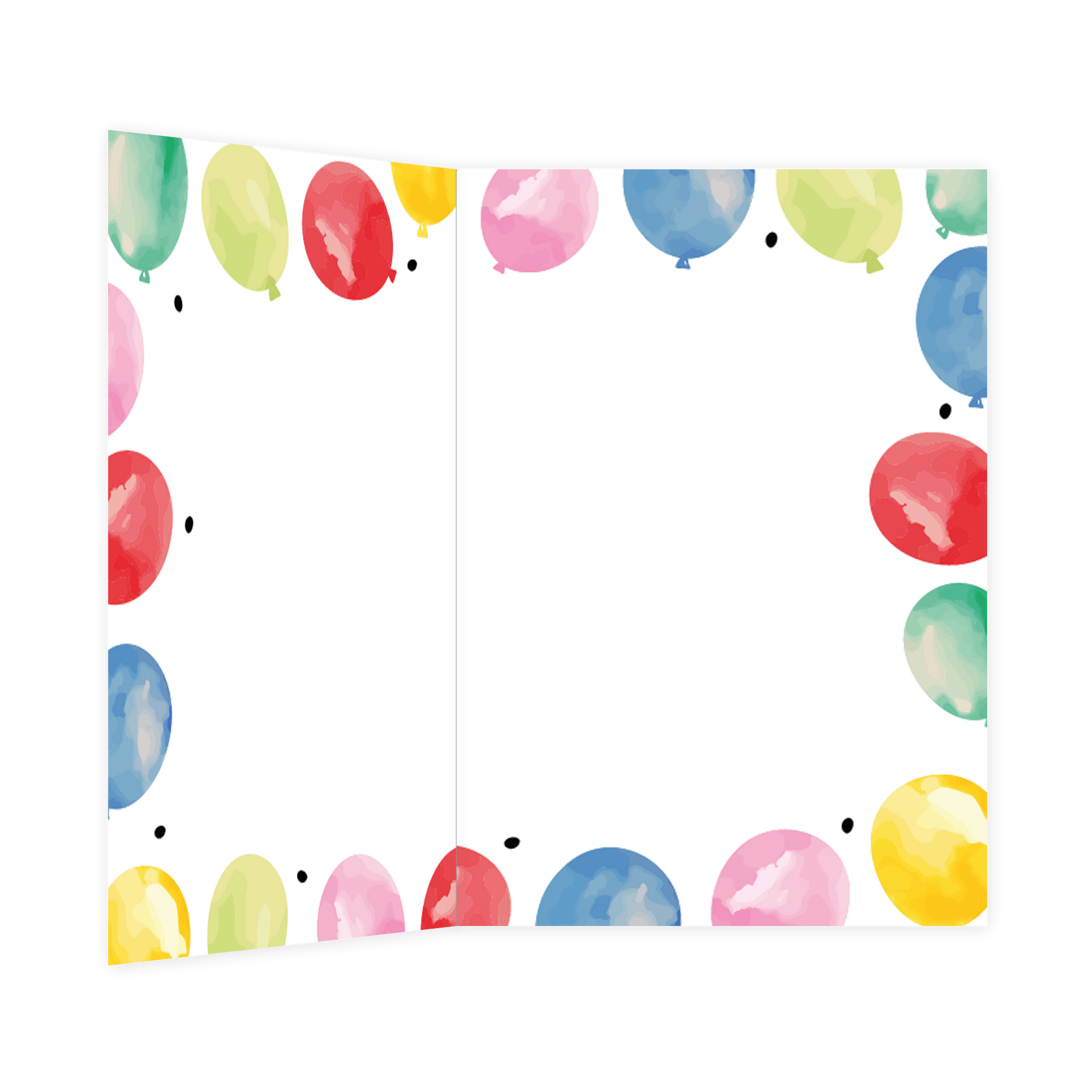 De wenskaart heeft een afmeting van x en een staande vorm. Op deze wenskaart staan ballonnen in de kleuren rood, geel, roze, blauw en groen, met in het midden de tekst: "Een dikke proficiat". De binnenzijde van de wenskaart is bedrukt met een ontwerp passend bij de voorzijde van de kaart .
