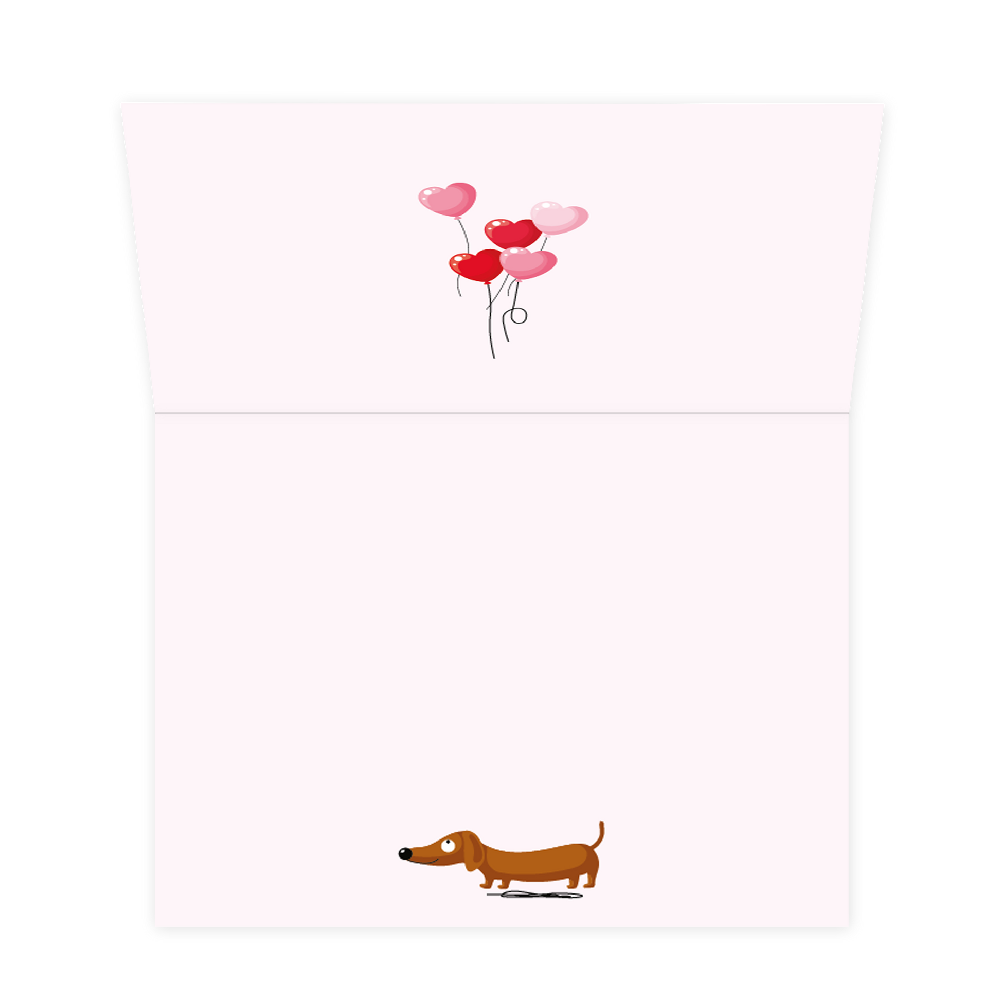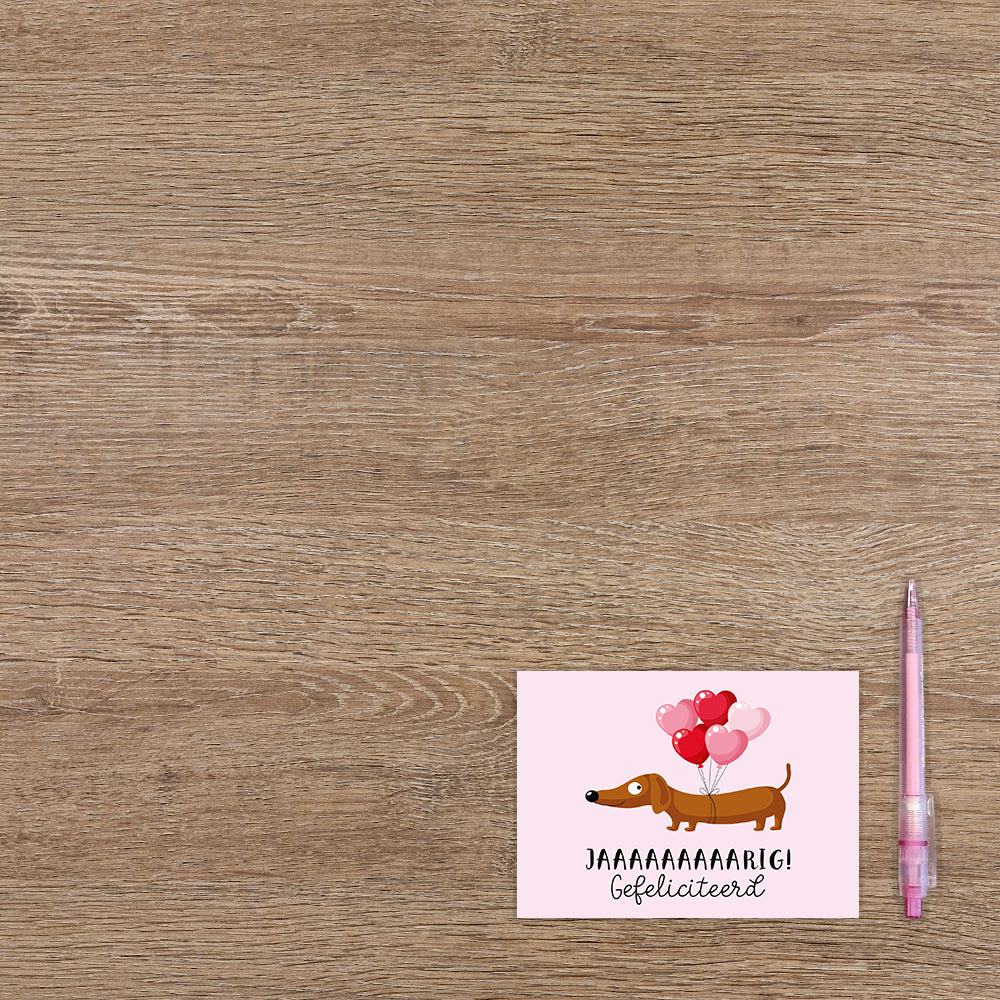 De wenskaart heeft een afmeting van x en een liggende vorm. Op deze wenskaart staat een teckel met een bos hartjesballonnen. Onder de illustratie staat de tekst: "Jaaarig! gefeliciteerd". De binnenzijde van de wenskaart is bedrukt met een ontwerp passend bij de voorzijde van de kaart .