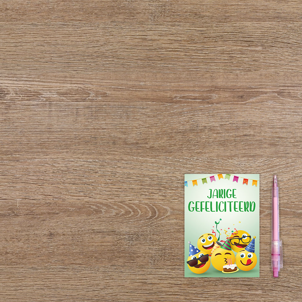 De wenskaart heeft een afmeting van x en een staande vorm. Op deze wenskaart staan smileys met feesthoedjes op en een taart, met in het midden de tekst: "Jarige gefeliciteerd". De binnenzijde van de wenskaart is bedrukt met een ontwerp passend bij de voorzijde van de kaart .
