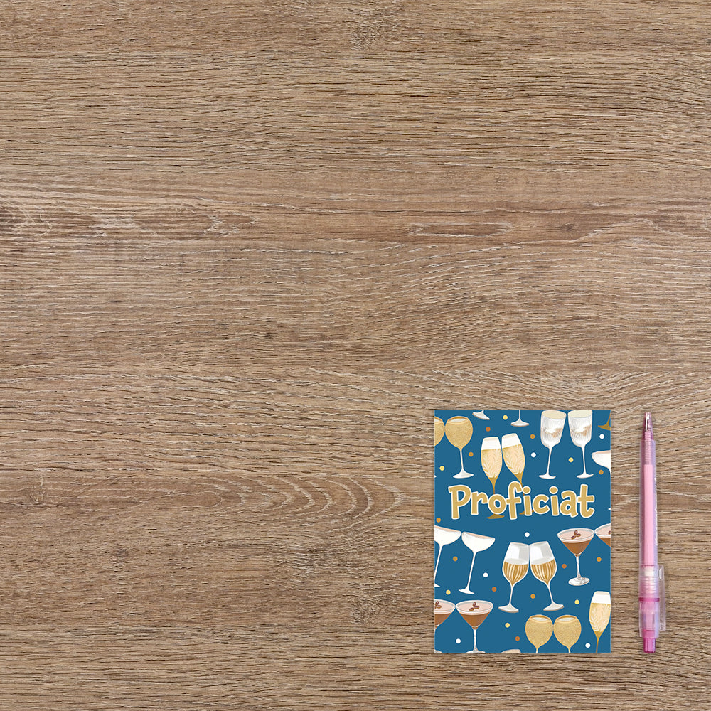 De wenskaart heeft een afmeting van x en een staande vorm. Op deze wenskaart staan wijnglazen, champagneglazen en cocktailglazen op een blauwe achtergrond. In het midden staat de tekst: "Proficiat". De binnenzijde van de wenskaart is bedrukt met een ontwerp passend bij de voorzijde van de kaart .