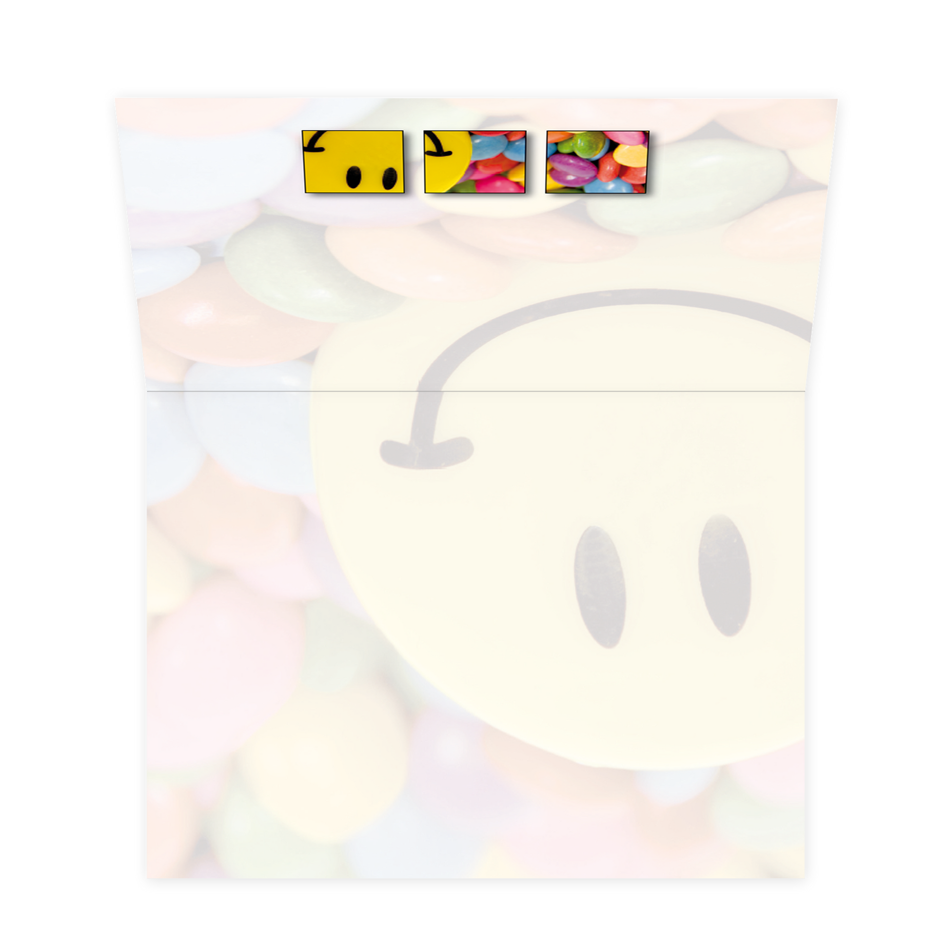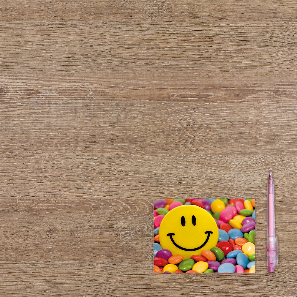 De wenskaart heeft een afmeting van x en een liggende vorm. Op deze wenskaart staat een smiley met gekleurde smarties. De binnenzijde van de wenskaart is bedrukt met een ontwerp passend bij de voorzijde van de kaart .