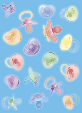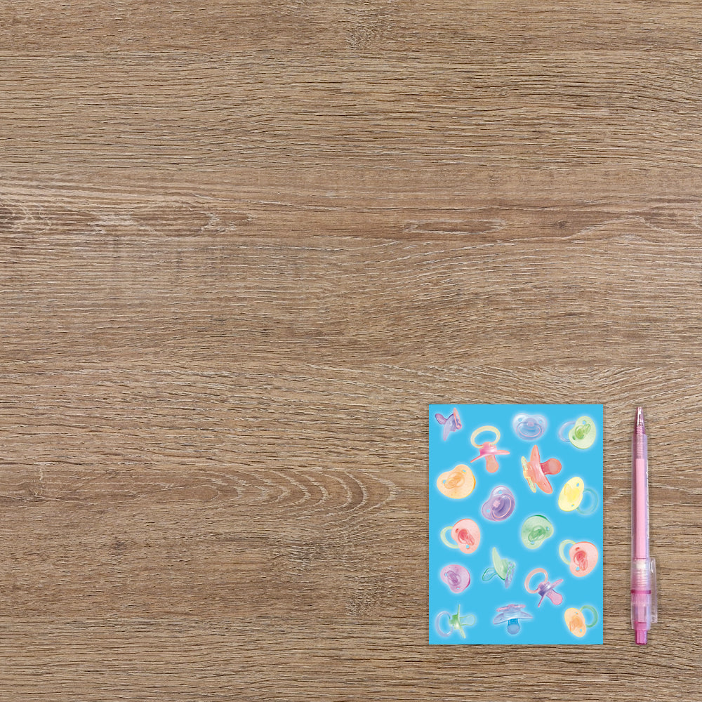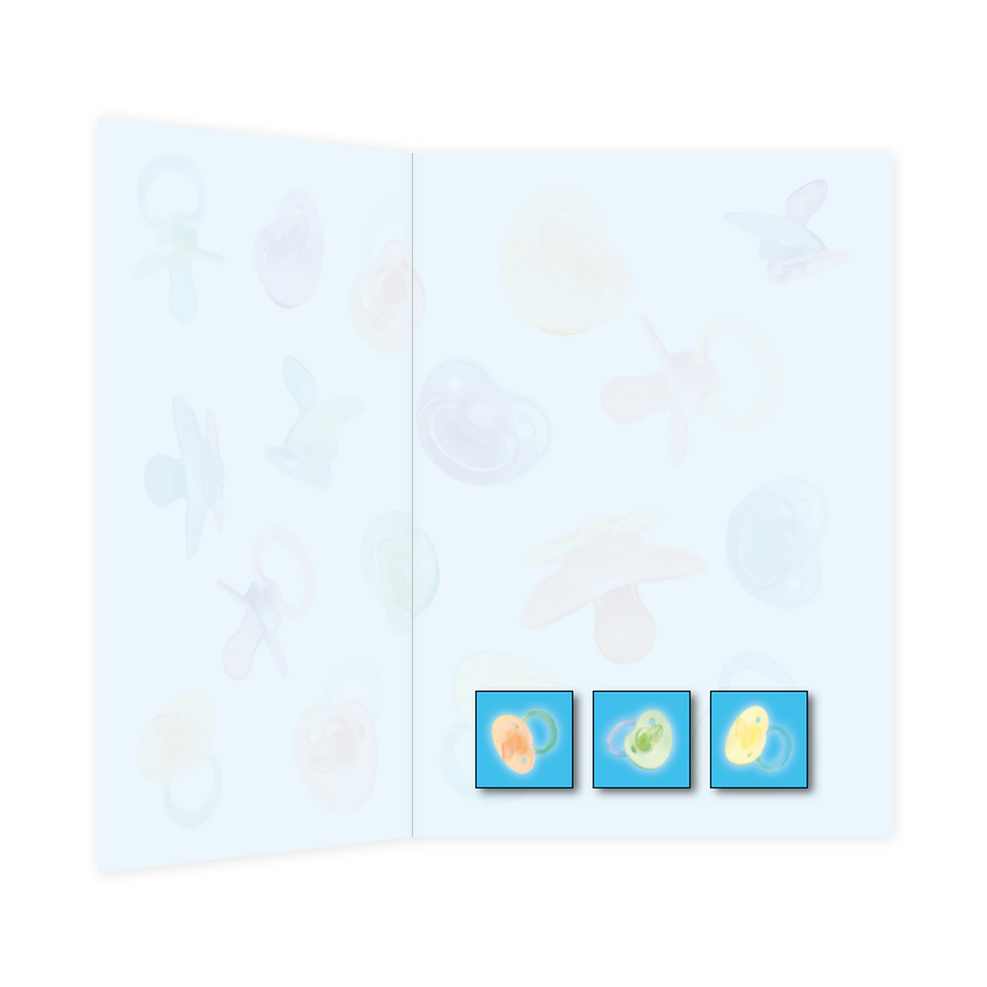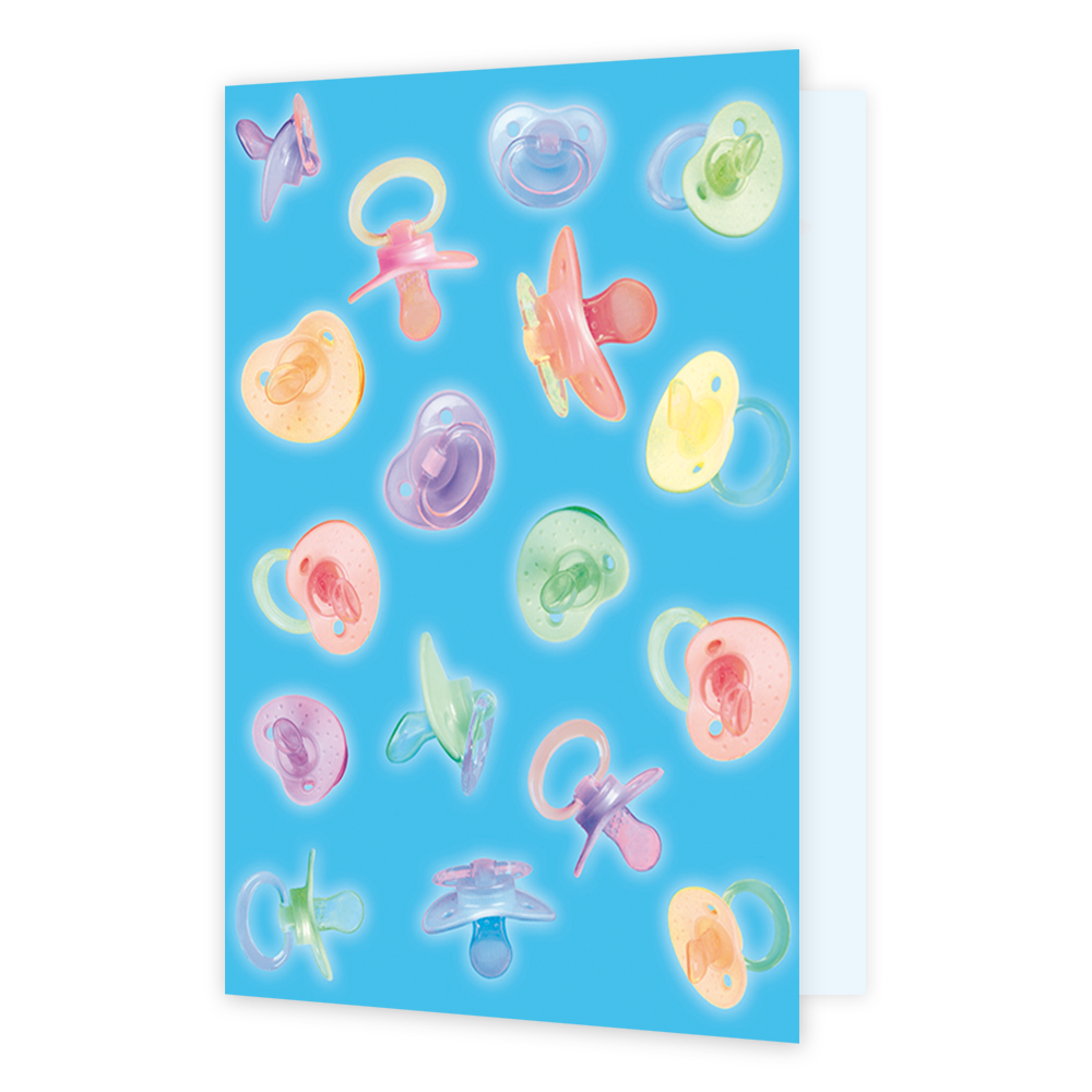 De wenskaart heeft een afmeting van x en een staande vorm. Op deze wenskaart staan babyspeentjes in de kleuren groen, geel, blauw, paars en roze, op een blauwe achtergrond. De binnenzijde van de wenskaart is bedrukt met een ontwerp passend bij de voorzijde van de kaart .