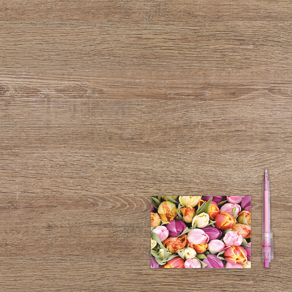 De wenskaart heeft een afmeting van x en een liggende vorm. Op deze wenskaart staan tulpen in de kleuren geel, roze, paars en oranje. De binnenzijde van de wenskaart is bedrukt met een ontwerp passend bij de voorzijde van de kaart .