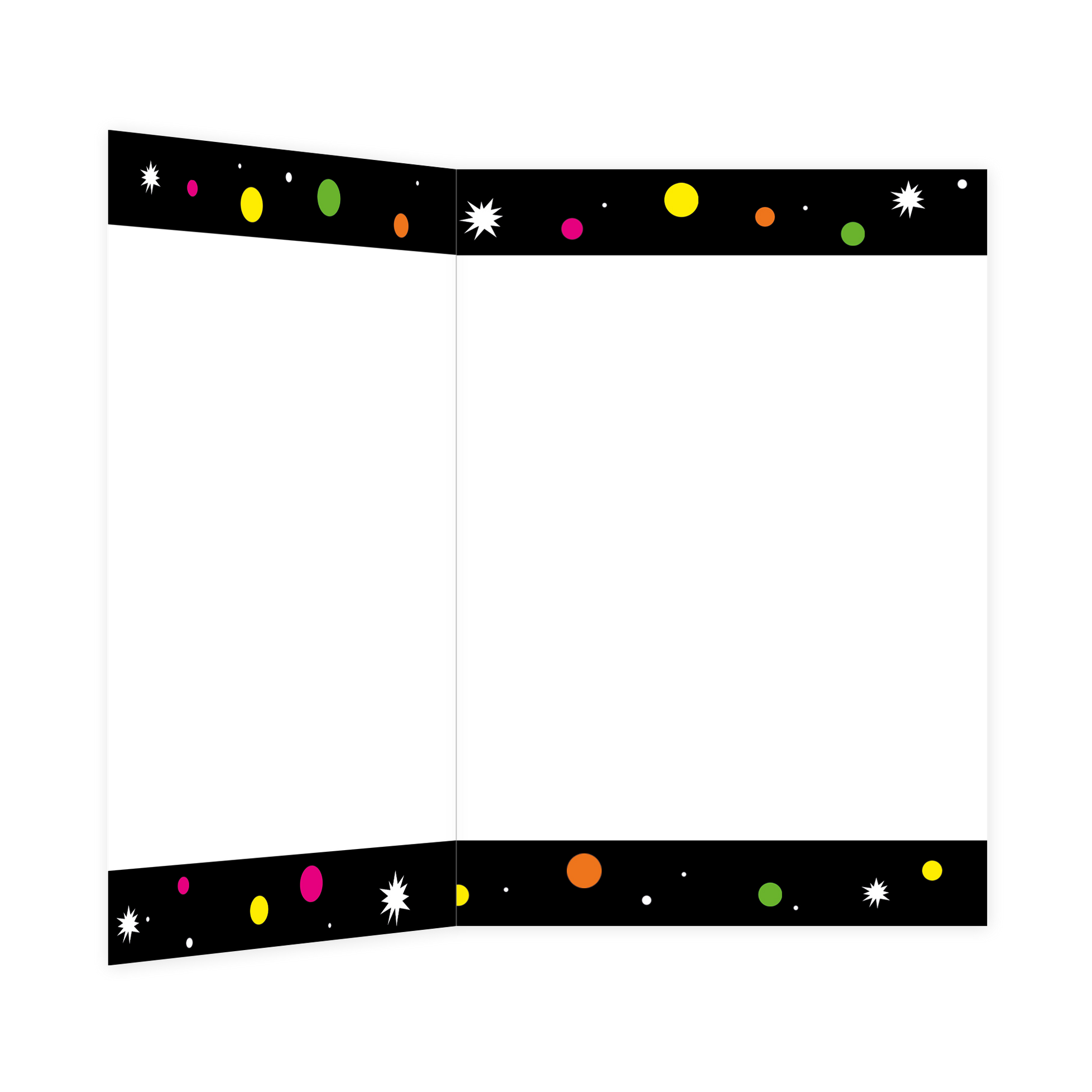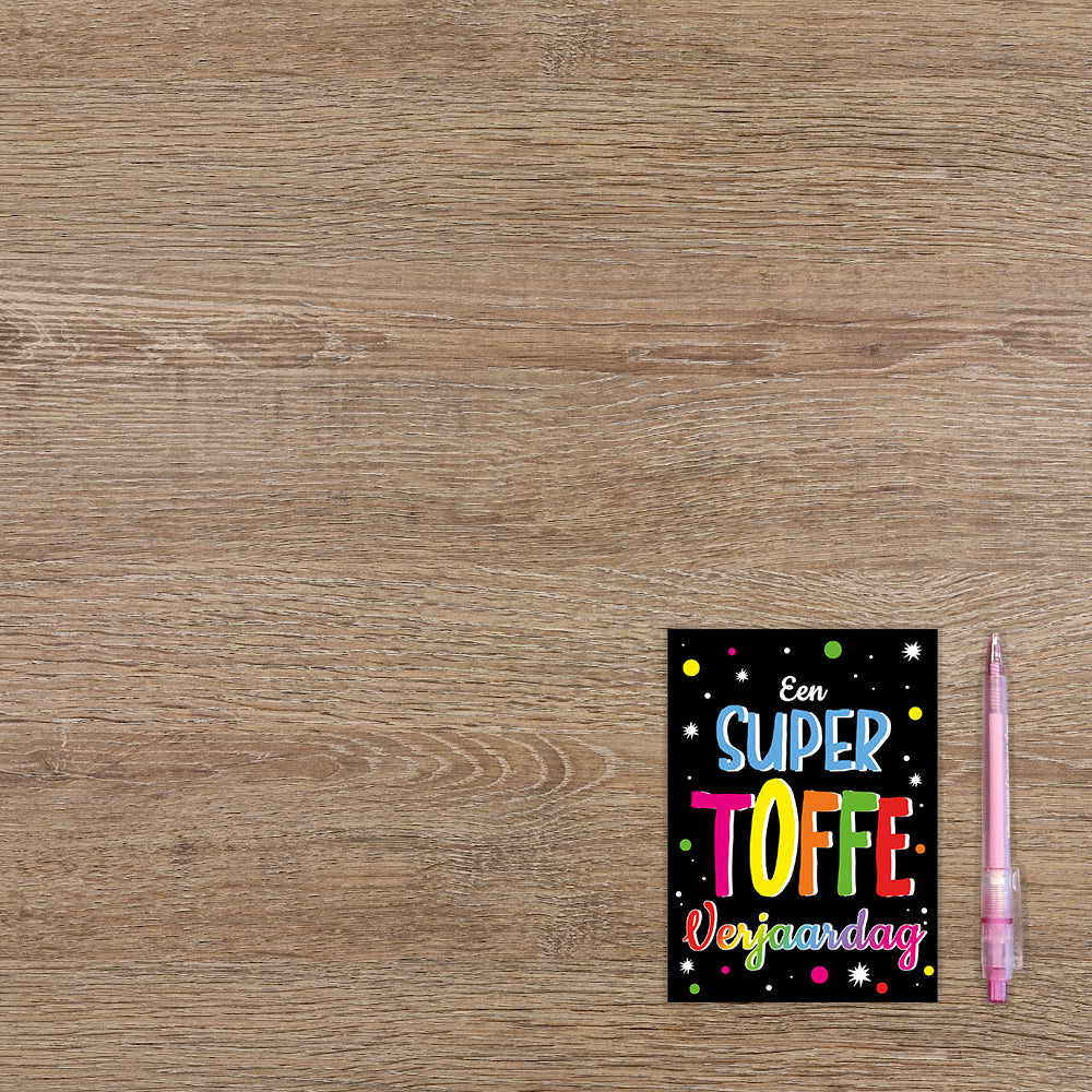 De wenskaart heeft een afmeting van x en een staande vorm. Op deze wenskaart staat de tekst: "Een super toffe verjaardag" op een zwarte achtergrond met sterren en stippen. De binnenzijde van de wenskaart is bedrukt met een ontwerp passend bij de voorzijde van de kaart .