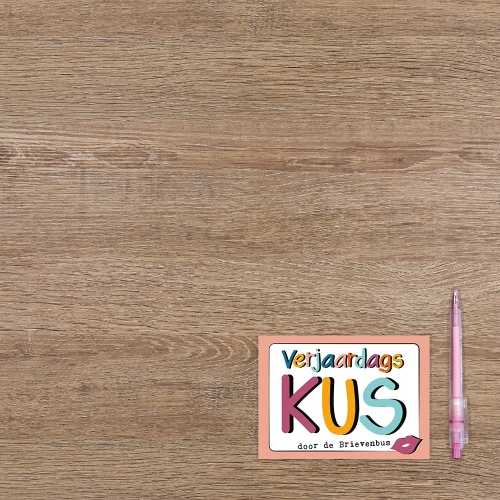 De wenskaart heeft een afmeting van x en een liggende vorm. Op deze wenskaart staat de tekst: "Verjaardsagskus door de brievenbus". De binnenzijde van de wenskaart is bedrukt met een ontwerp passend bij de voorzijde van de kaart .