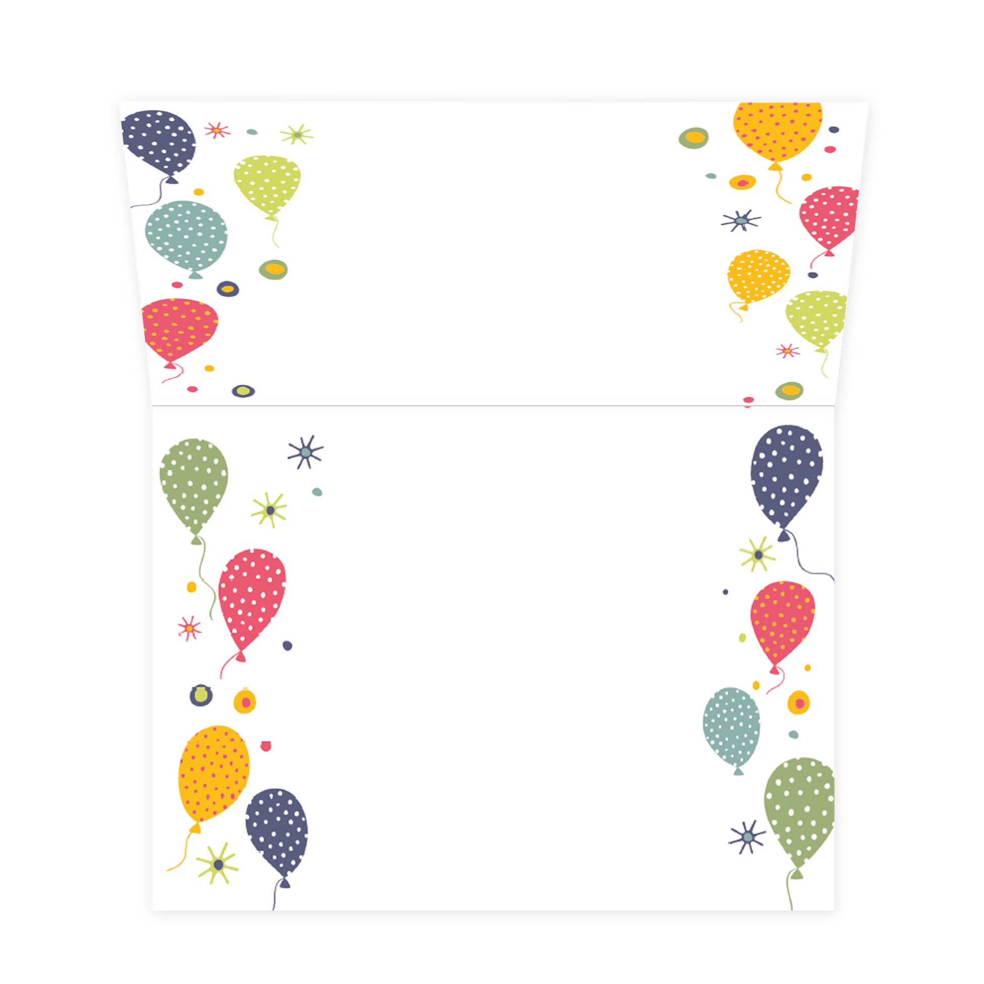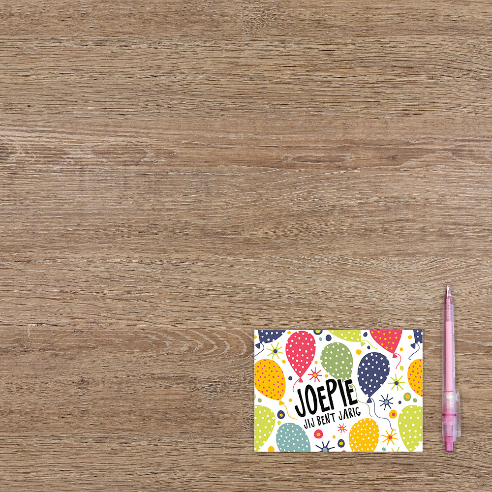 De wenskaart heeft een afmeting van x en een liggende vorm. Op deze wenskaart staan ballonnen in de kleuren groen, blauw, rood en oranje met in het midden de tekst: "Joepie jij bent jarig". De binnenzijde van de wenskaart is bedrukt met een ontwerp passend bij de voorzijde van de kaart .