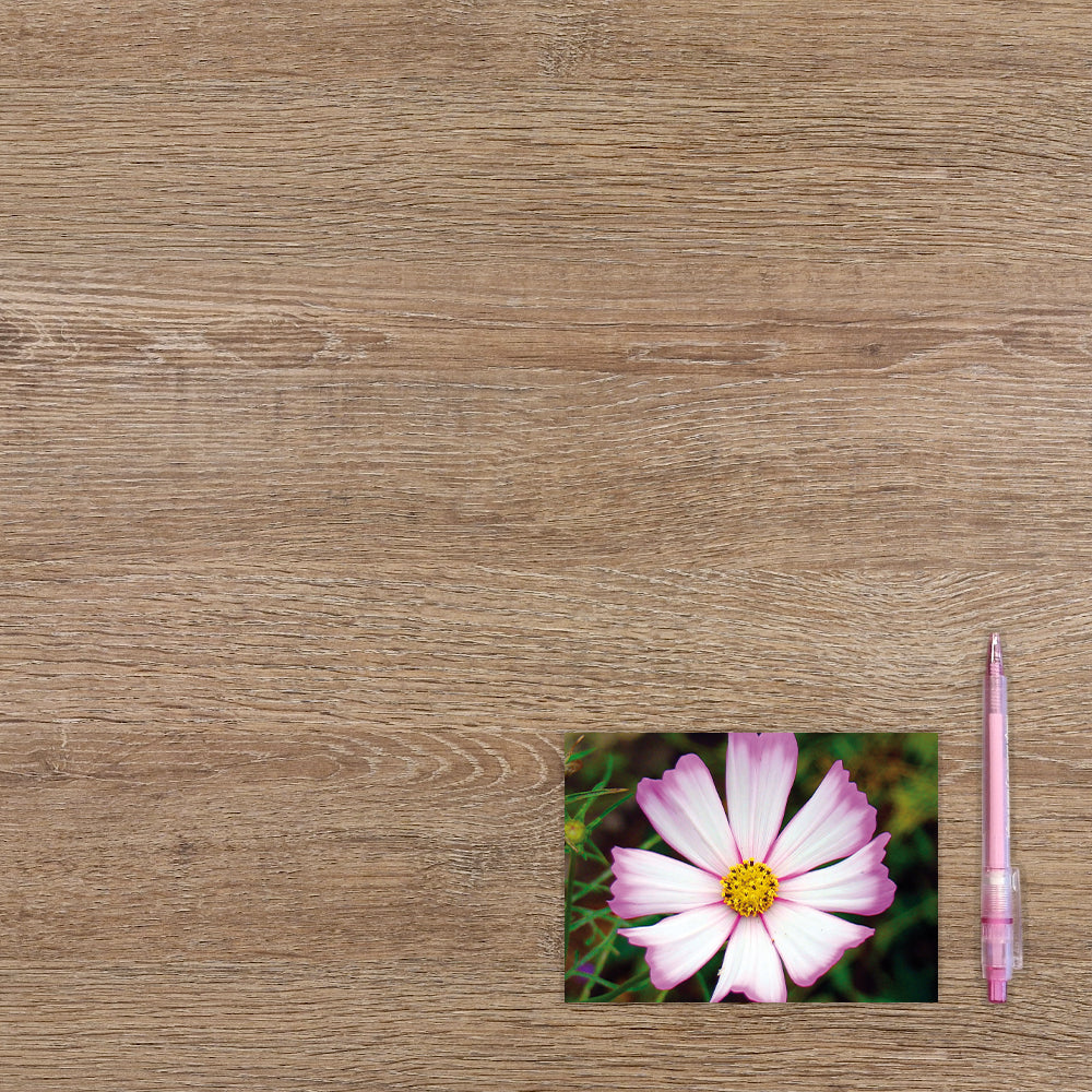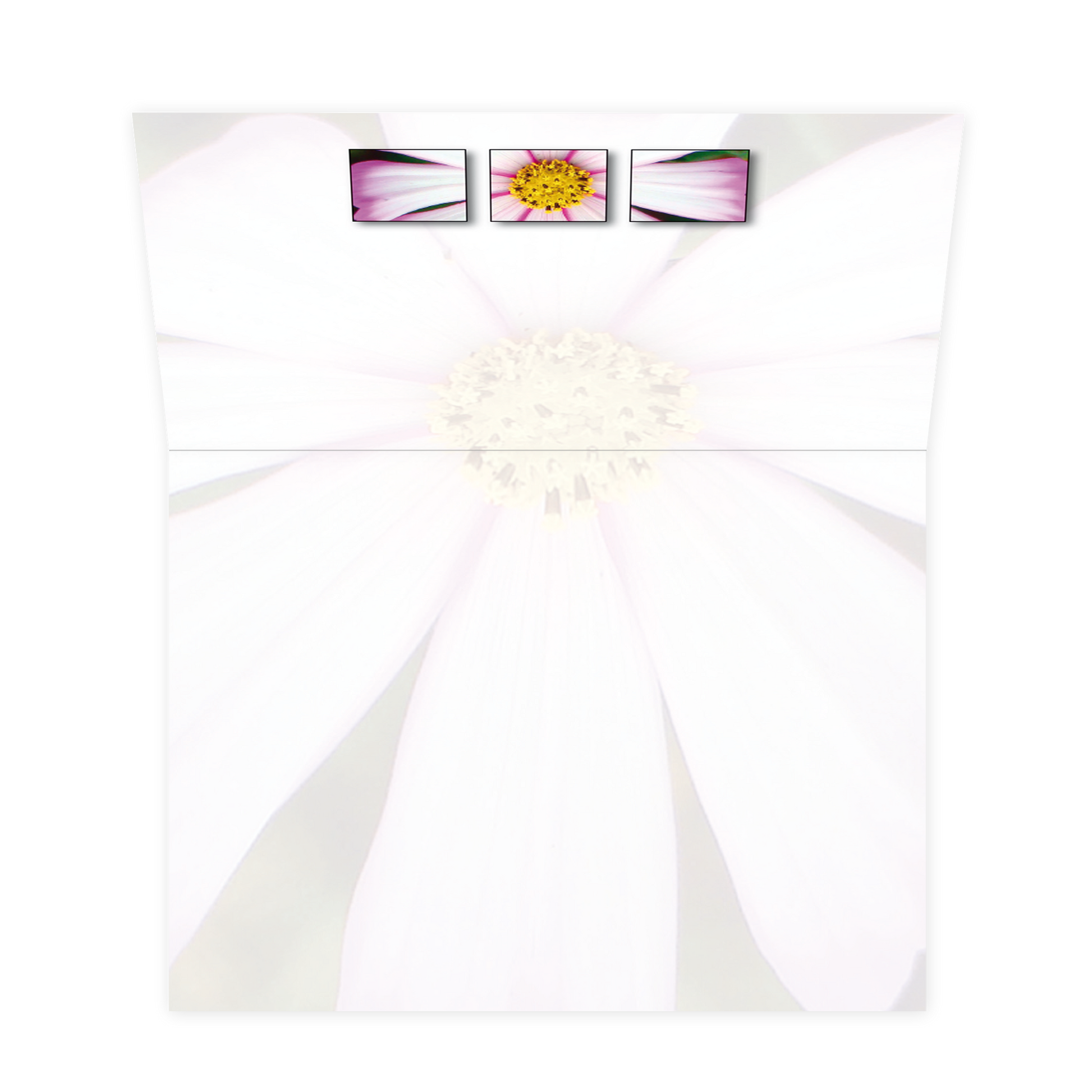 De wenskaart heeft een afmeting van x en een liggende vorm. Op deze wenskaart staat een paars met witte bloem. De binnenzijde van de wenskaart is bedrukt met een ontwerp passend bij de voorzijde van de kaart .