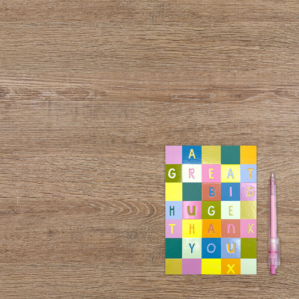 De wenskaart heeft een afmeting van x en een staande vorm. Op deze wenskaart staan vakjes in de kleuren paars, groen, oranje, geel, rood en blauw. In de vakjes staan letters die de tekst: "A great big hug thank you x" vormen. De binnenzijde van de wenskaart is blanco wat voldoende ruimte geeft om een persoonlijke boodschap te schrijven .