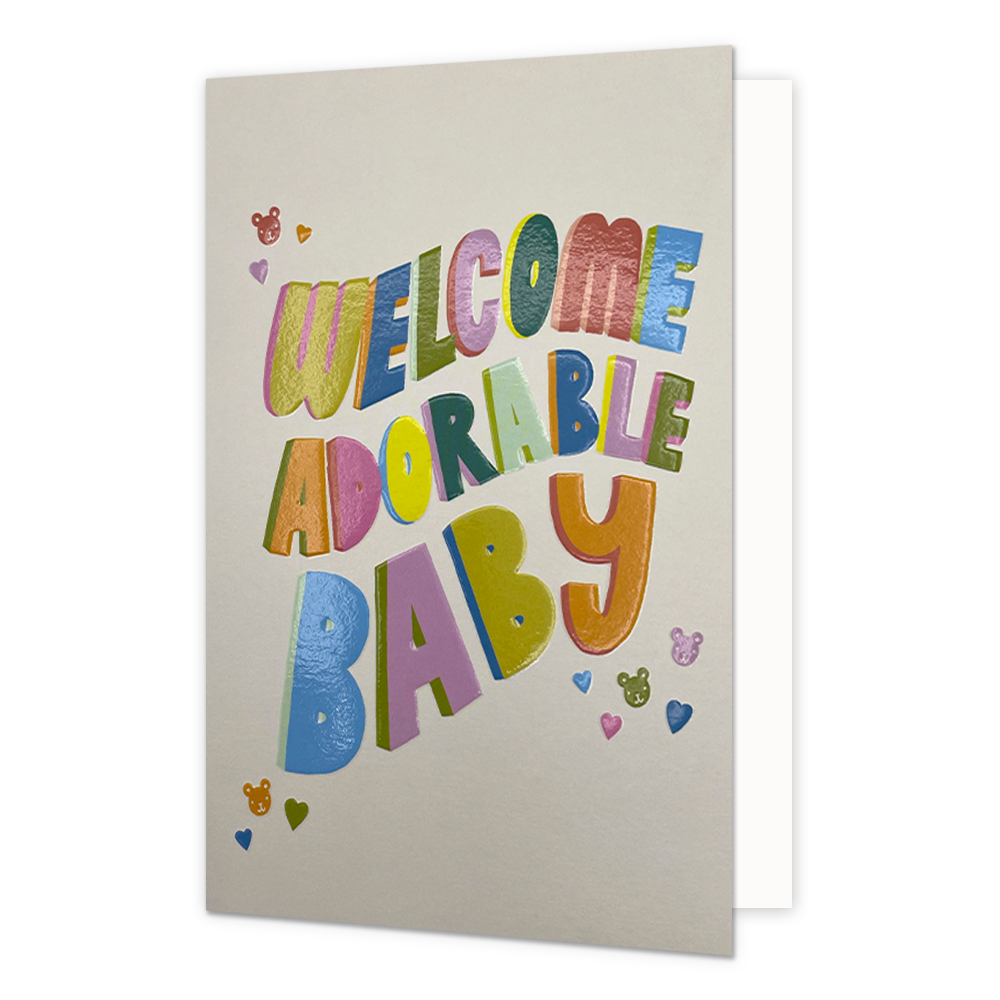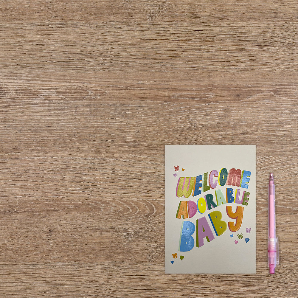 De wenskaart heeft een afmeting van x en een staande vorm. Op deze wenskaart staat de tekst: "Welcome adorable baby". De binnenzijde van de wenskaart is blanco wat voldoende ruimte geeft om een persoonlijke boodschap te schrijven .