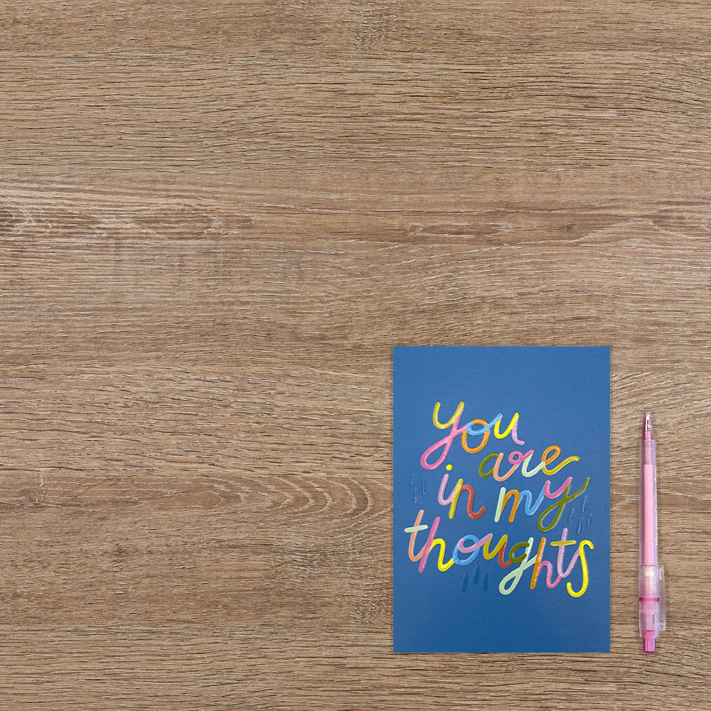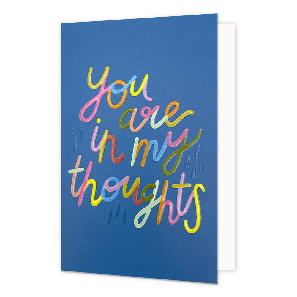 De wenskaart heeft een afmeting van x en een staande vorm. Op deze wenskaart staat de tekst: "You are in my thoughts". De binnenzijde van de wenskaart is blanco wat voldoende ruimte geeft om een persoonlijke boodschap te schrijven .