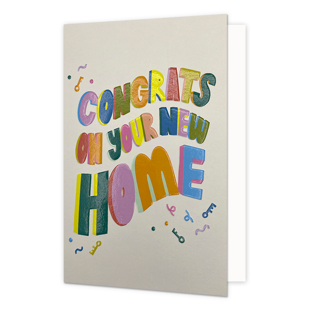 De wenskaart heeft een afmeting van x en een staande vorm. Op deze wenskaart staat de tekst: "Congrats on your new home". De binnenzijde van de wenskaart is blanco wat voldoende ruimte geeft om een persoonlijke boodschap te schrijven .