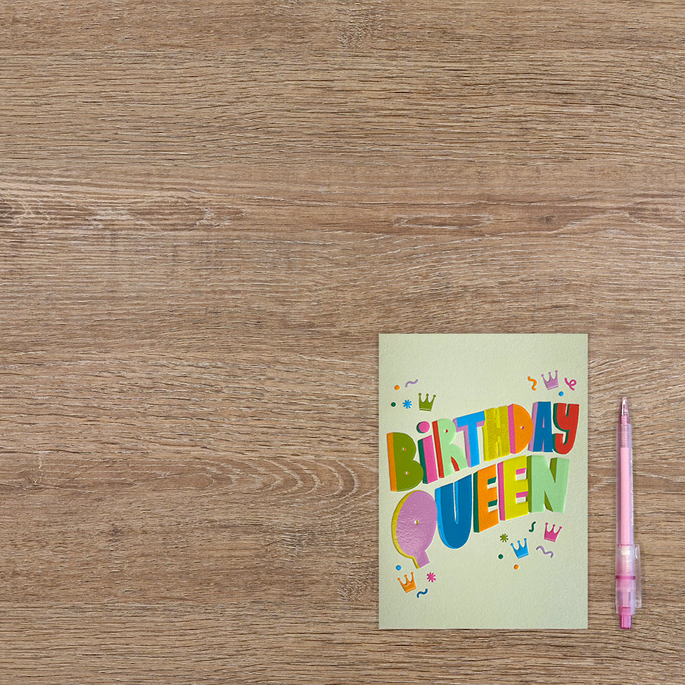 De wenskaart heeft een afmeting van x en een staande vorm. Op deze wenskaart staat de tekst: "Birthday queen". De binnenzijde van de wenskaart is blanco wat voldoende ruimte geeft om een persoonlijke boodschap te schrijven .