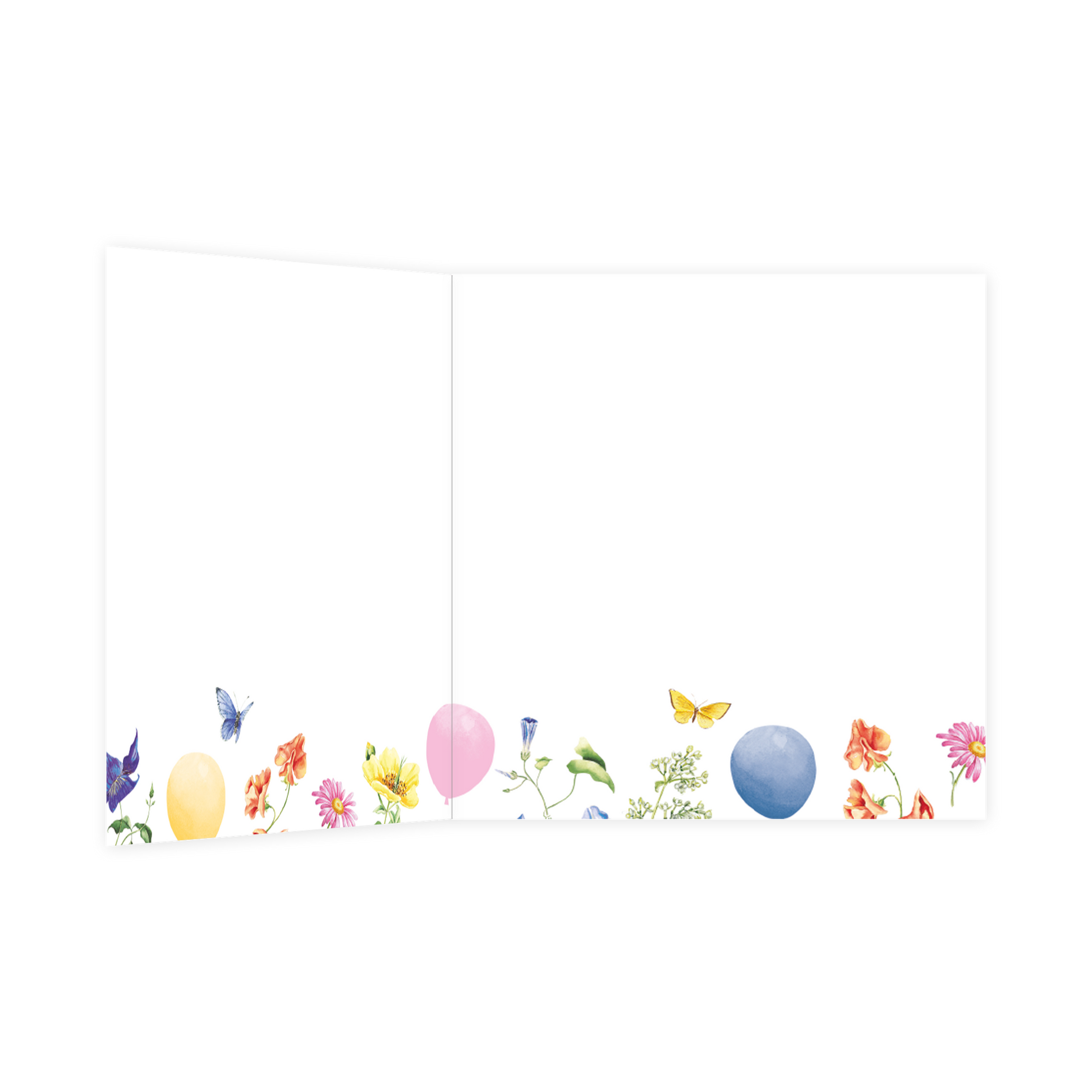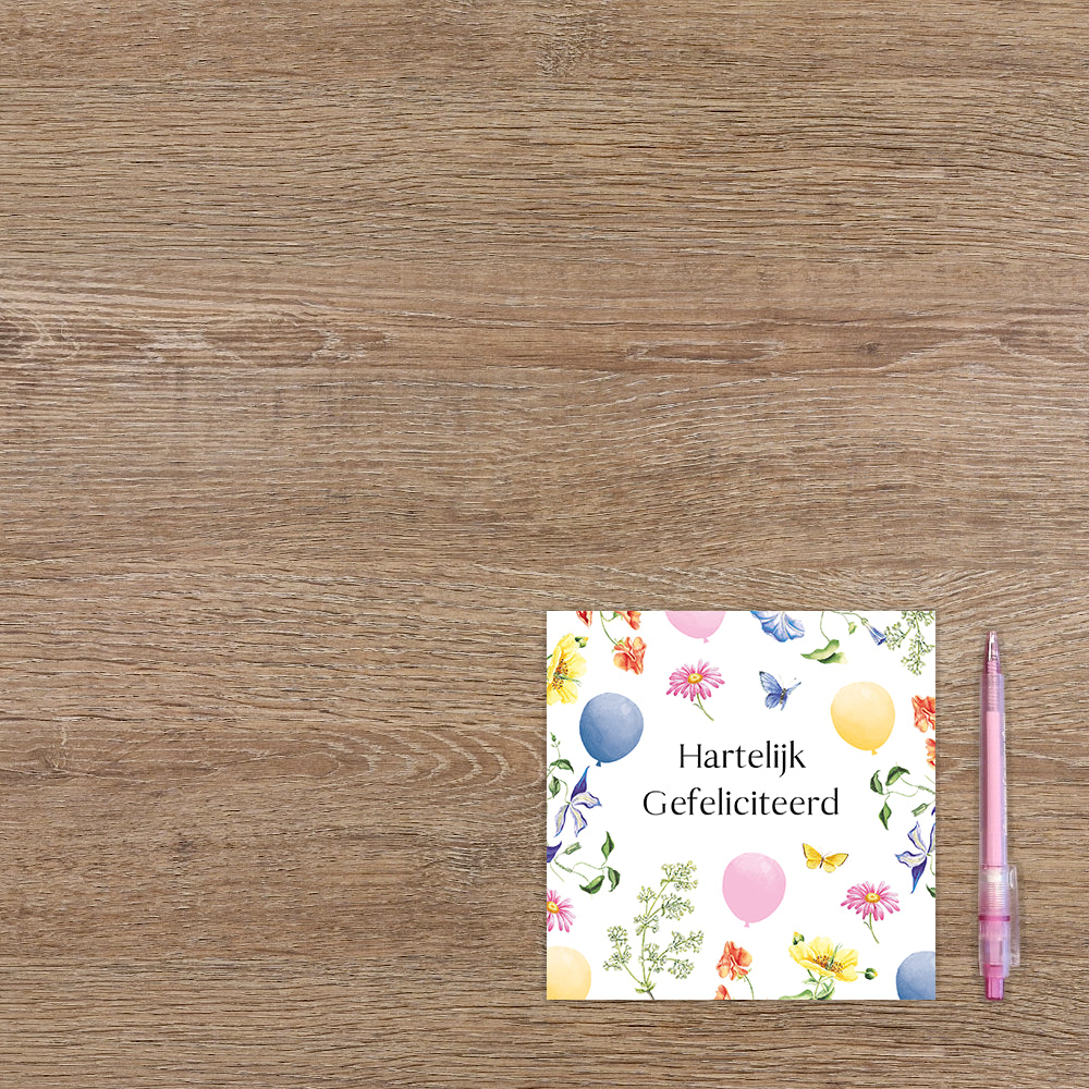 De wenskaart heeft een afmeting van x en een vierkante vorm. Op deze wenskaart staan bloemen en vlinders in de kleuren rood, paars, geel en groen, met in het midden de tekst: "Fijne verjaardag". De binnenzijde van de wenskaart is bedrukt met een ontwerp passend bij de voorzijde van de kaart .