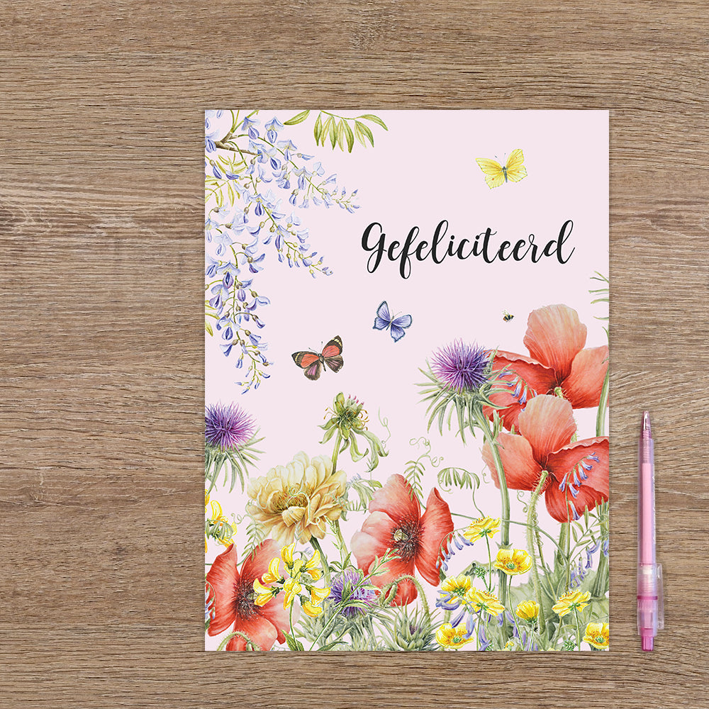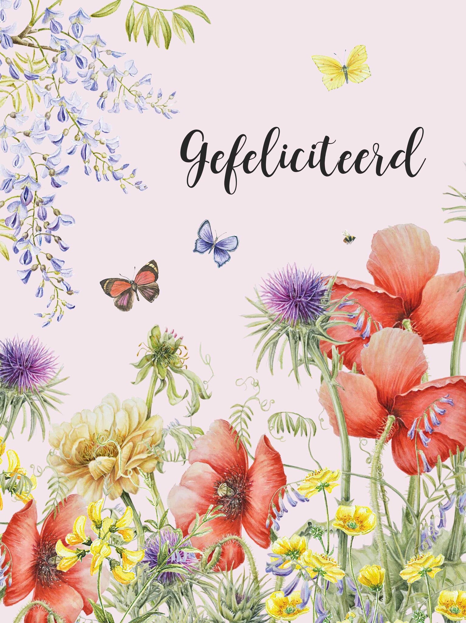 De wenskaart heeft een afmeting van x en een staande vorm. Op deze wenskaart staan bloemen en vlinders in de kleuren rood, paars, geel, groen en blauw met in het midden de tekst: "Gefeliciteerd". De binnenzijde van de wenskaart is bedrukt met een ontwerp passend bij de voorzijde van de kaart .