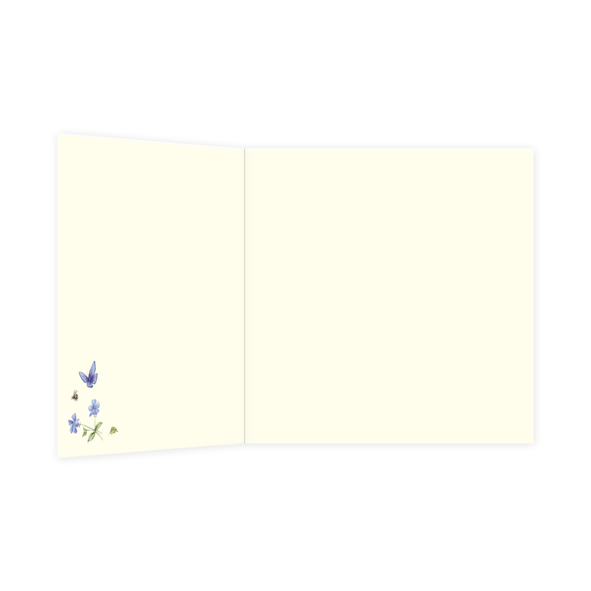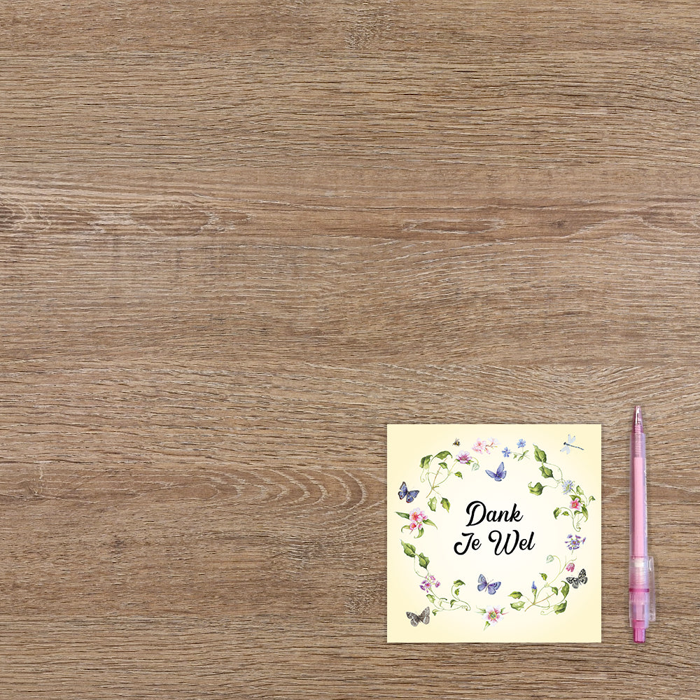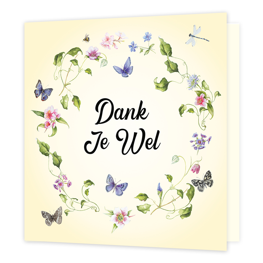 De wenskaart heeft een afmeting van x en een vierkante vorm. Op deze wenskaart staat een bloemenkrans omringt door vlinders en een libelle. In het midden staat de tekst: "Dank je wel". De binnenzijde van de wenskaart is bedrukt met een ontwerp passend bij de voorzijde van de kaart .