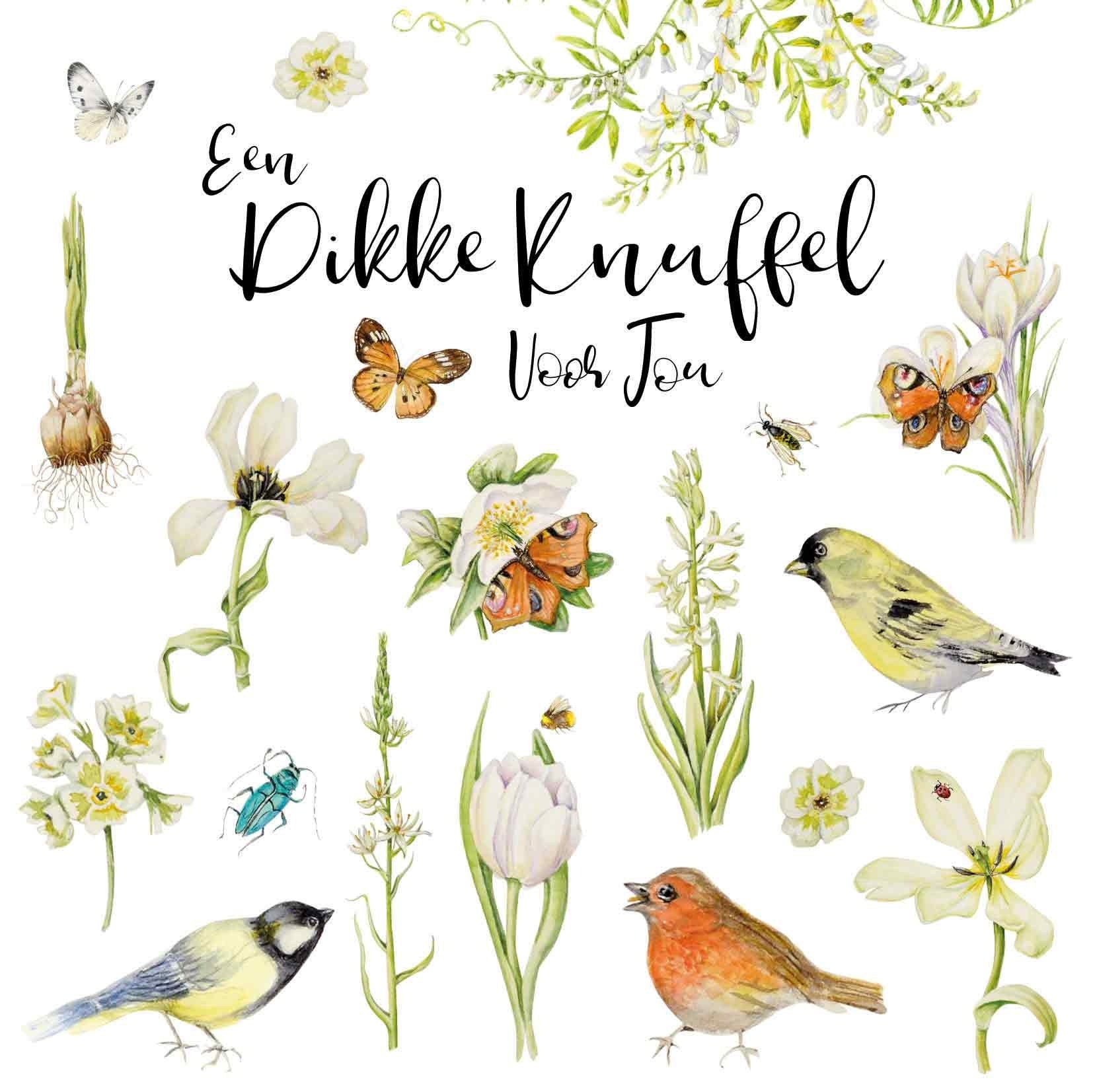 De wenskaart heeft een afmeting van x en een vierkante vorm. Op deze wenskaart staan bloemen, vogels en vlinders met in het midden de tekst: "Een dikke knuffel voor jou". De binnenzijde van de wenskaart is blanco wat voldoende ruimte geeft om een persoonlijke boodschap te schrijven .