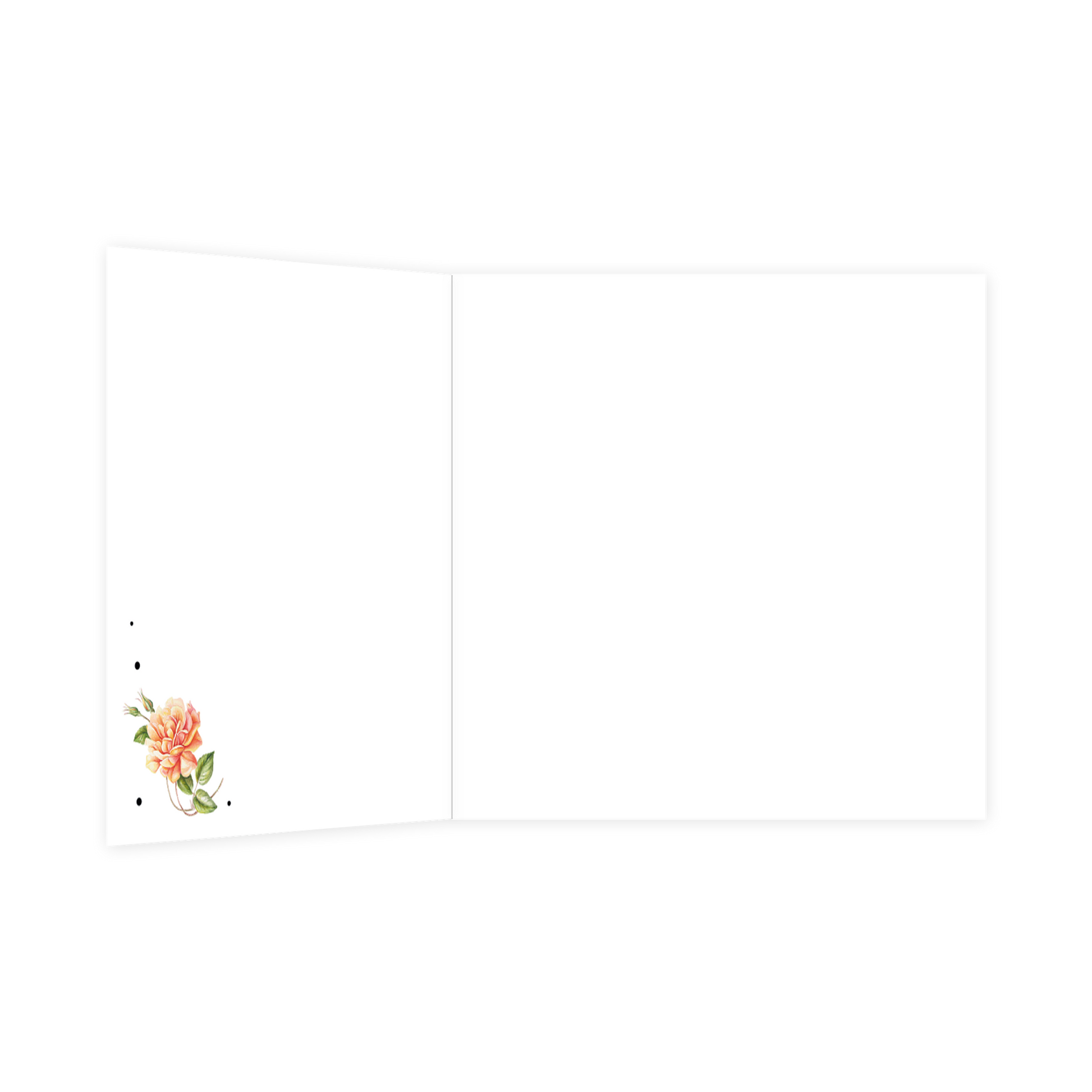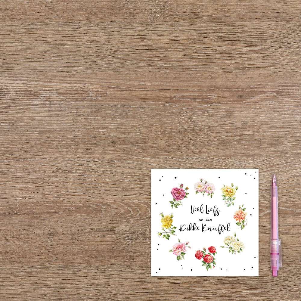 De wenskaart heeft een afmeting van x en een vierkante vorm. Op deze wenskaart staan bloemen die een kring vormen met in het midden de tekst: "Veel liefs en een dikke knuffel". De binnenzijde van de wenskaart is blanco wat voldoende ruimte geeft om een persoonlijke boodschap te schrijven .