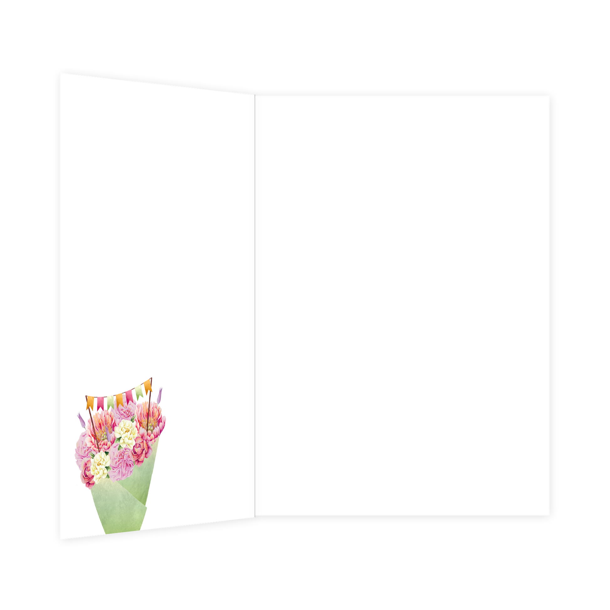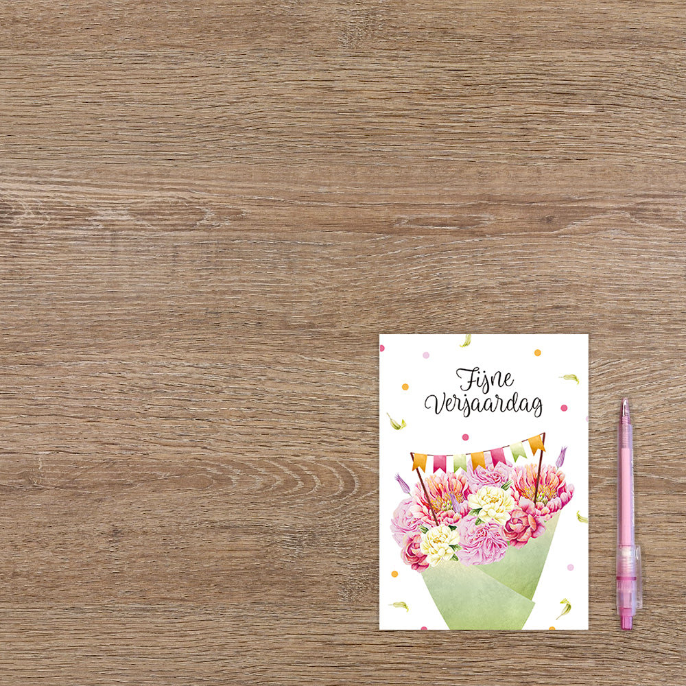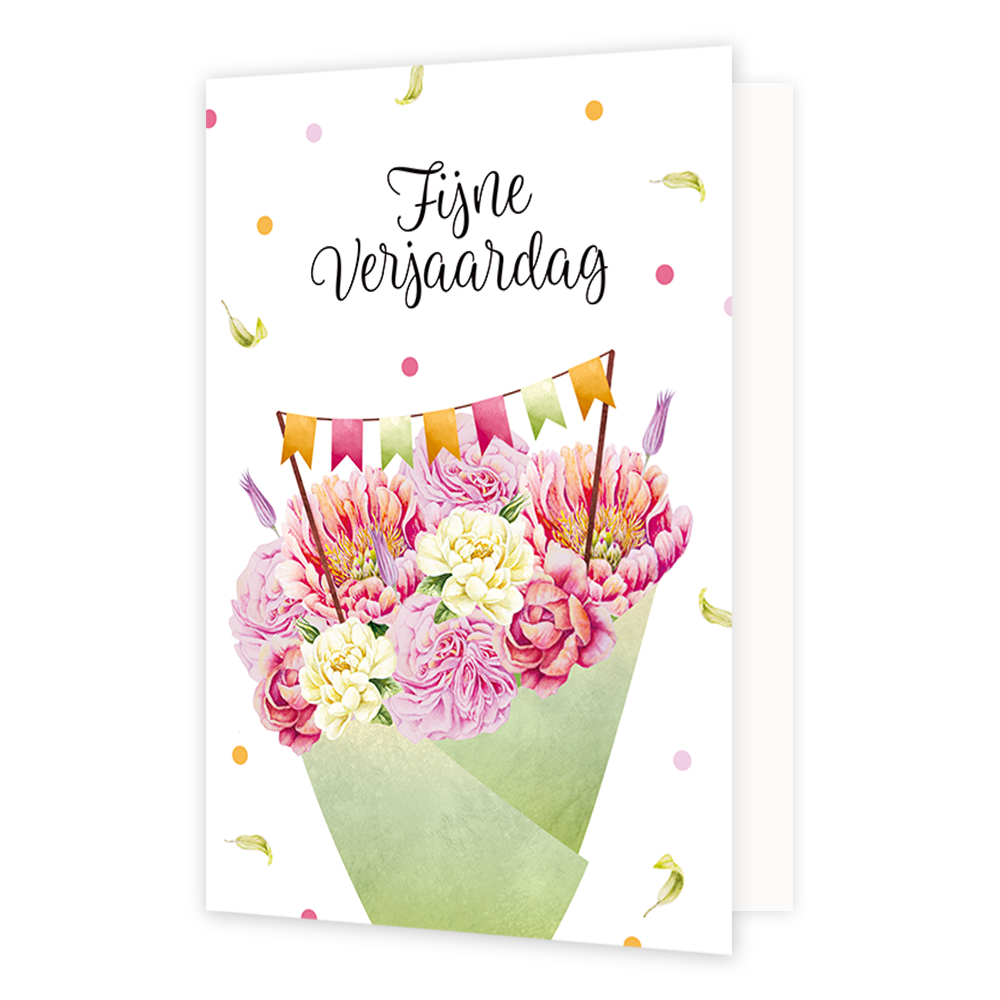De wenskaart heeft een afmeting van x en een staande vorm. Op deze wenskaart staat een bloemenboeket met de kleuren wit, roze, rood en oranje. Boven het boeket staat de tekst: "Fijne verjaardag". De binnenzijde van de wenskaart is bedrukt met een ontwerp passend bij de voorzijde van de kaart .