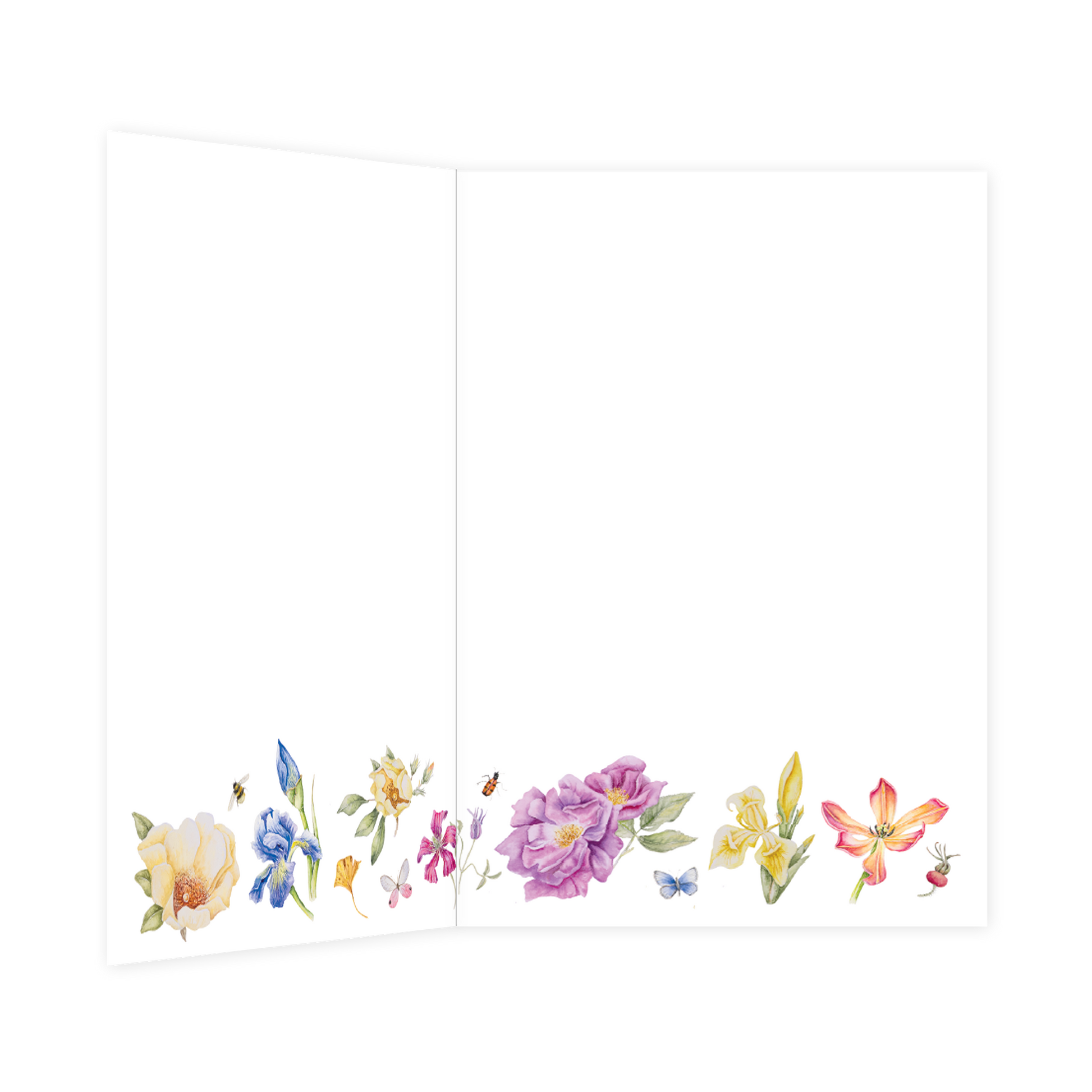 De wenskaart heeft een afmeting van x en een staande vorm. Op deze wenskaart staan diverse soorten bloemen in de kleuren blauw, paars, roze, lila geel en rood. In het midden staat de tekst: "van harte gefeliciteerd". De binnenzijde van de wenskaart is bedrukt met een ontwerp passend bij de voorzijde van de kaart .