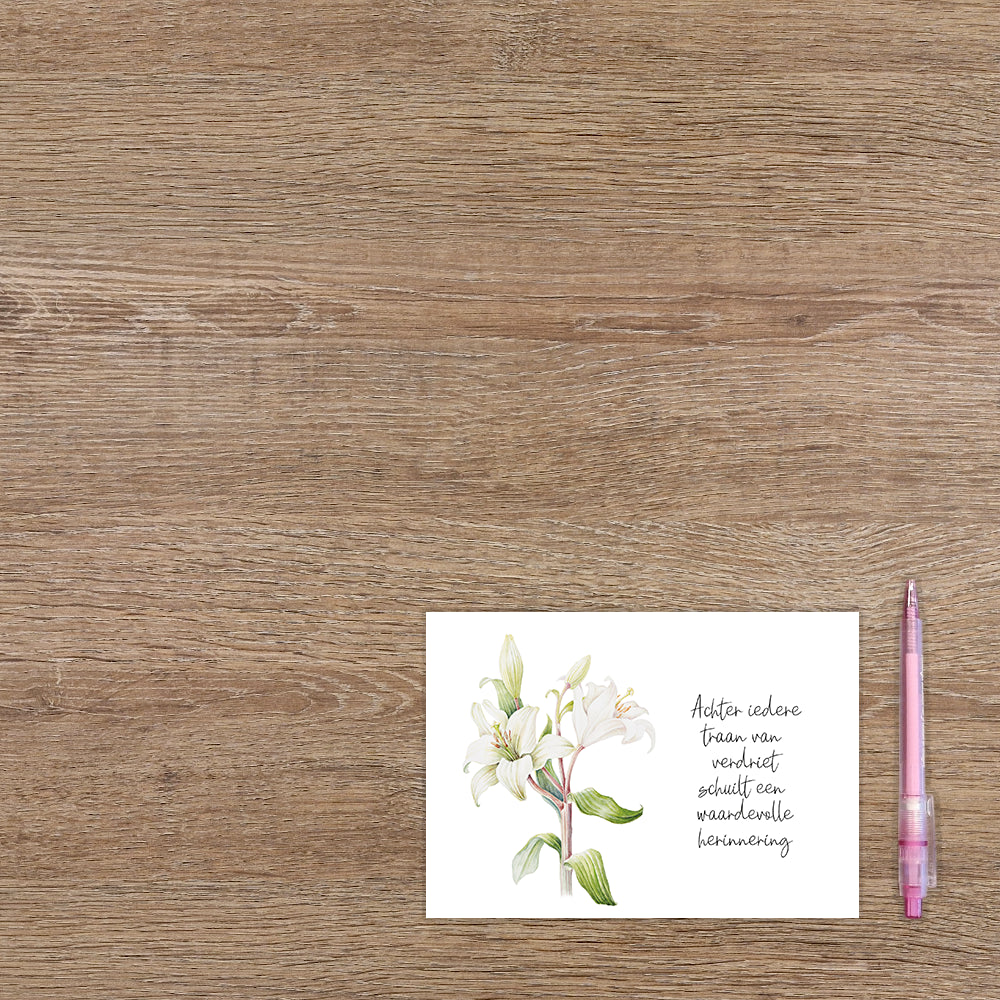 De wenskaart heeft een afmeting van x en een liggende vorm. Op deze wenskaart staan witte bloemen met rechts daarnaast de tekst: "Achter iedere traan van verdriet schuilt een waardevolle herinnering". De binnenzijde van de wenskaart is bedrukt met een ontwerp passend bij de voorzijde van de kaart en de tekst "Met oprechte deelneming".