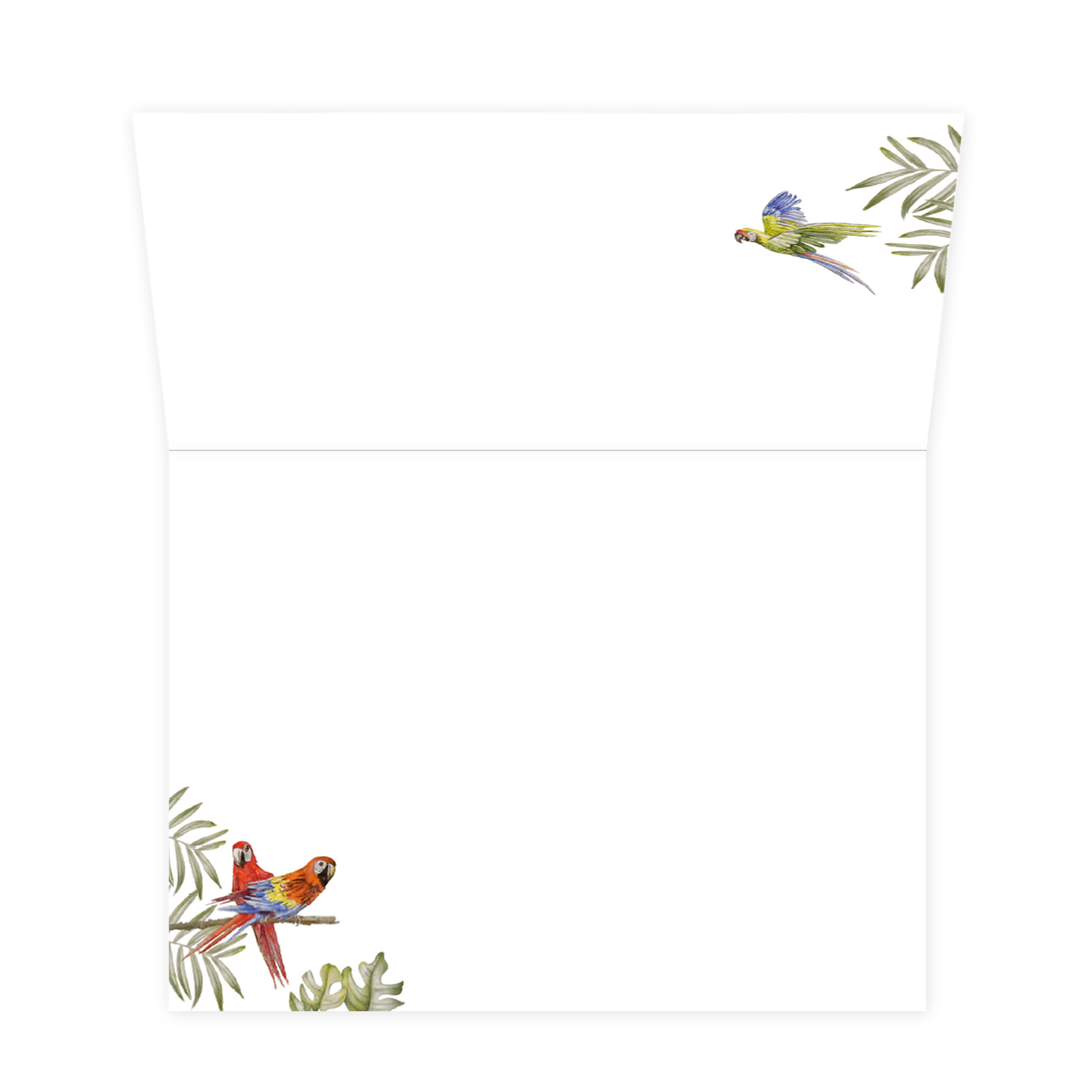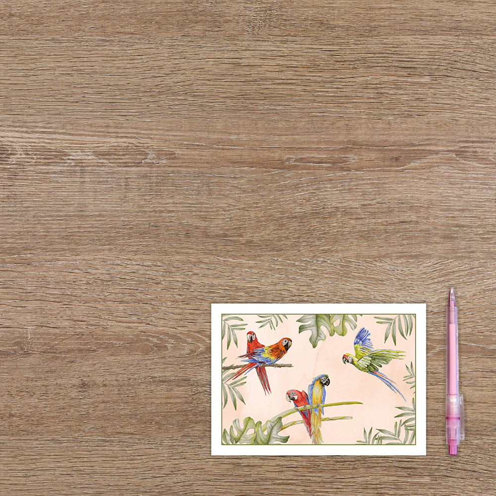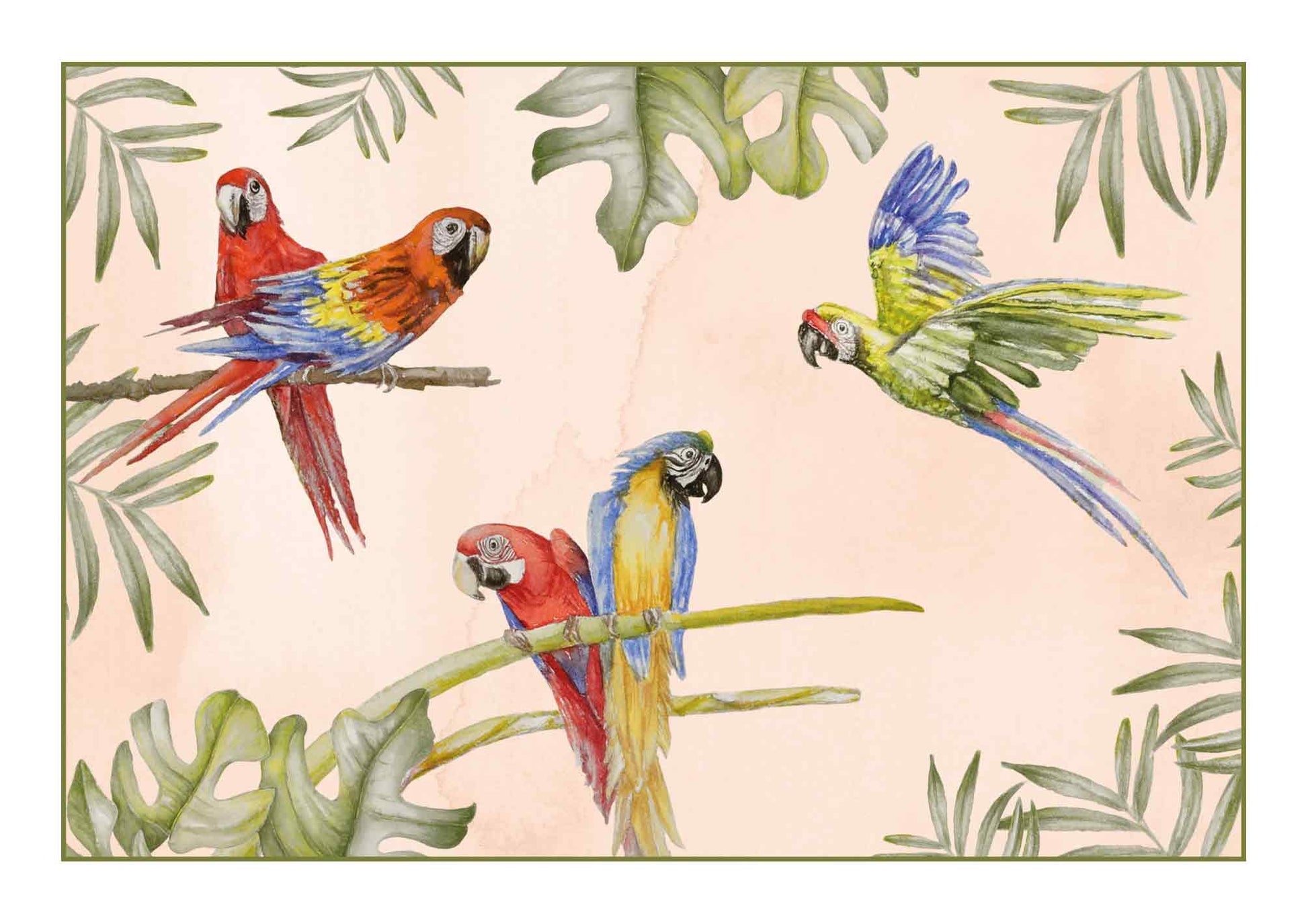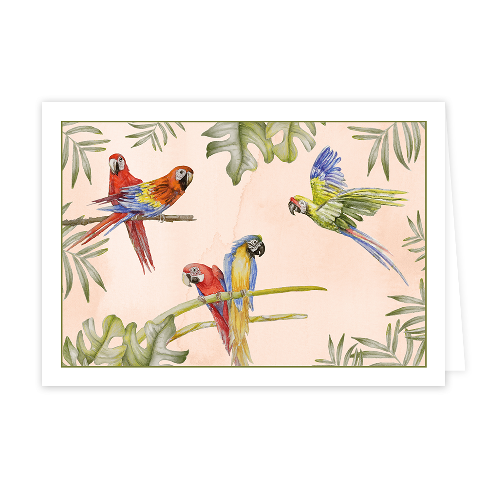 De wenskaart heeft een afmeting van x en een liggende vorm. Op deze wenskaart staan vijf ara papegaaien en groene bladeren. De binnenzijde van de wenskaart is bedrukt met een ontwerp passend bij de voorzijde van de kaart en de tekst .