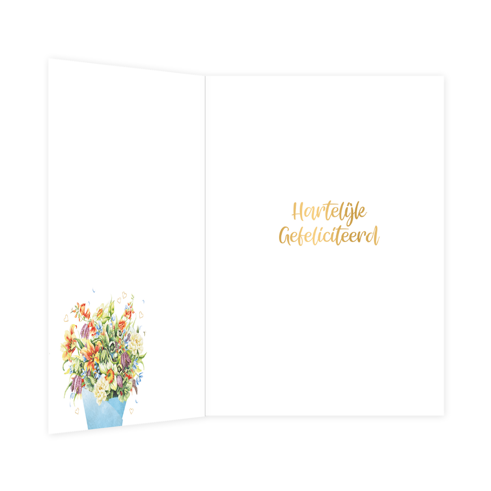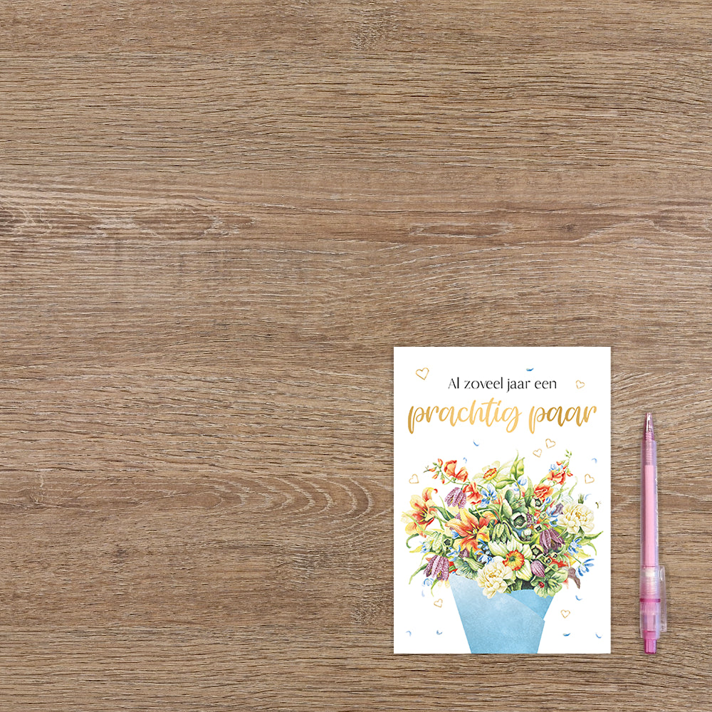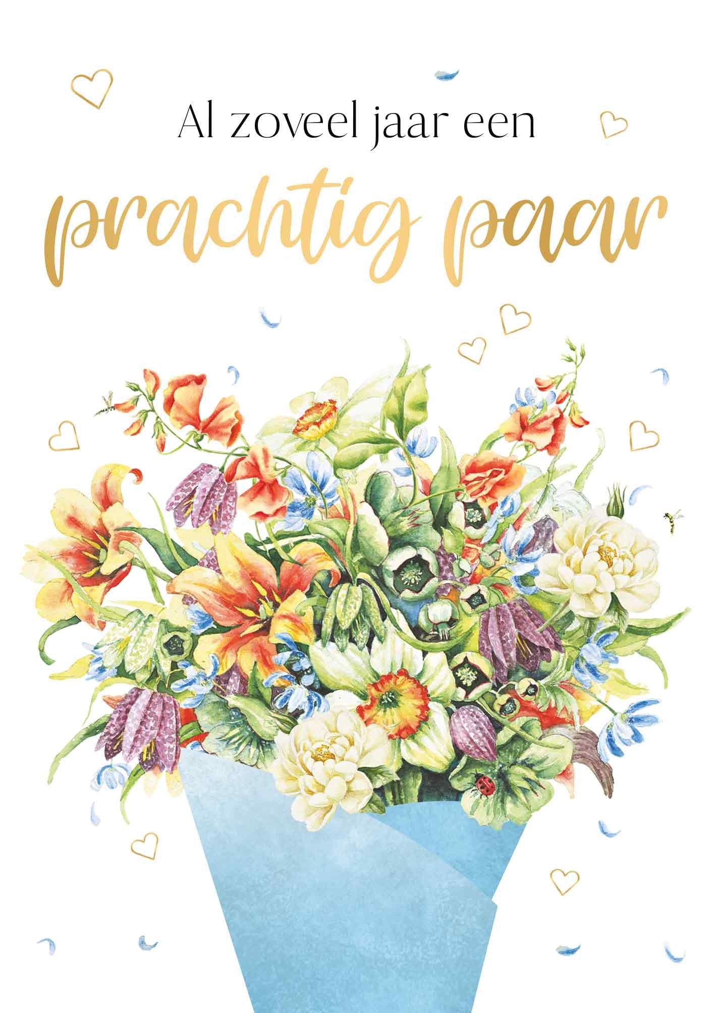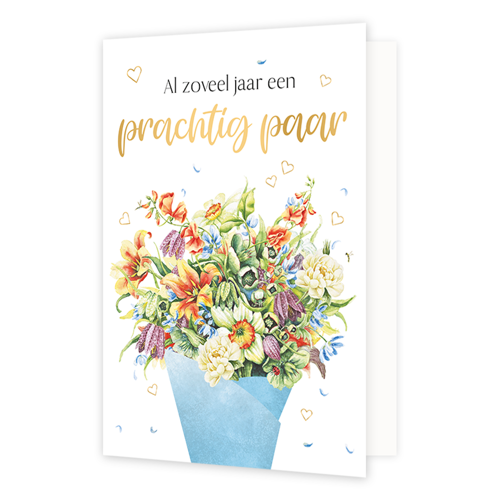 De wenskaart heeft een afmeting van x en een staande vorm. Op deze wenskaart staat een boeket met bloemen en daarboven de tekst: "Al zoveel jaar een prachtig paar". De binnenzijde van de wenskaart is bedrukt met een ontwerp passend bij de voorzijde van de kaart en de tekst "Hartelijk gefeliciteerd".