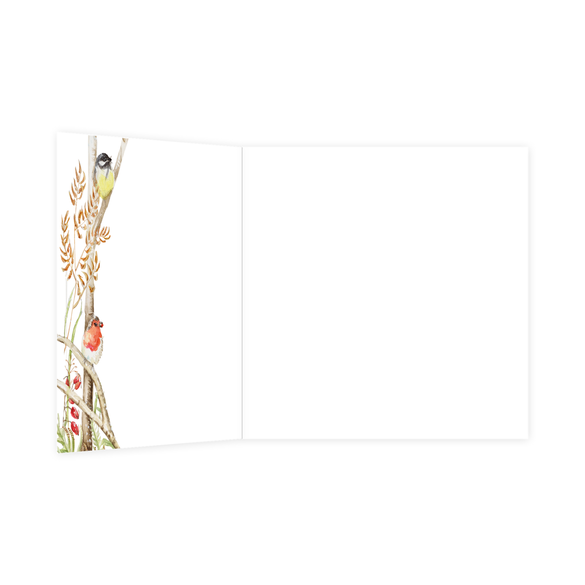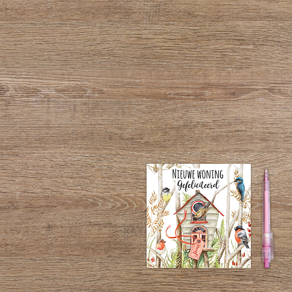 De wenskaart heeft een afmeting van x en een vierkante vorm. Op deze wenskaart staan vogels en een vogelhuisje met daarboven de tekst: "Nieuwe woning gefeliciteerd". De binnenzijde van de wenskaart is blanco wat voldoende ruimte geeft om een persoonlijke boodschap te schrijven .