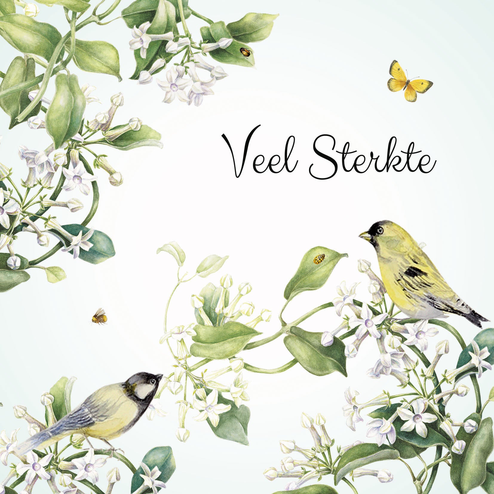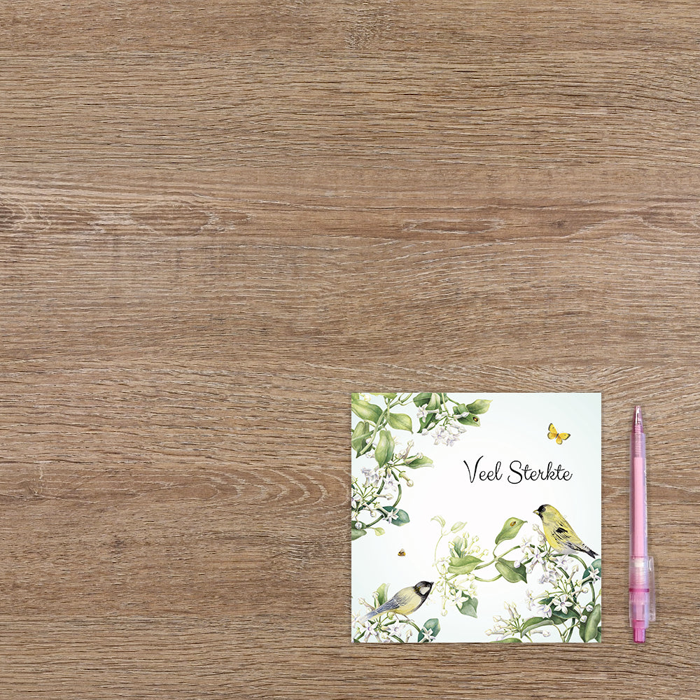 De wenskaart heeft een afmeting van x en een vierkante vorm. Op deze wenskaart staan witte bloemen met groene bladeren en twee vogels. In de illustratie staat de tekst: "Veel sterkte". De binnenzijde van de wenskaart is blanco wat voldoende ruimte geeft om een persoonlijke boodschap te schrijven .