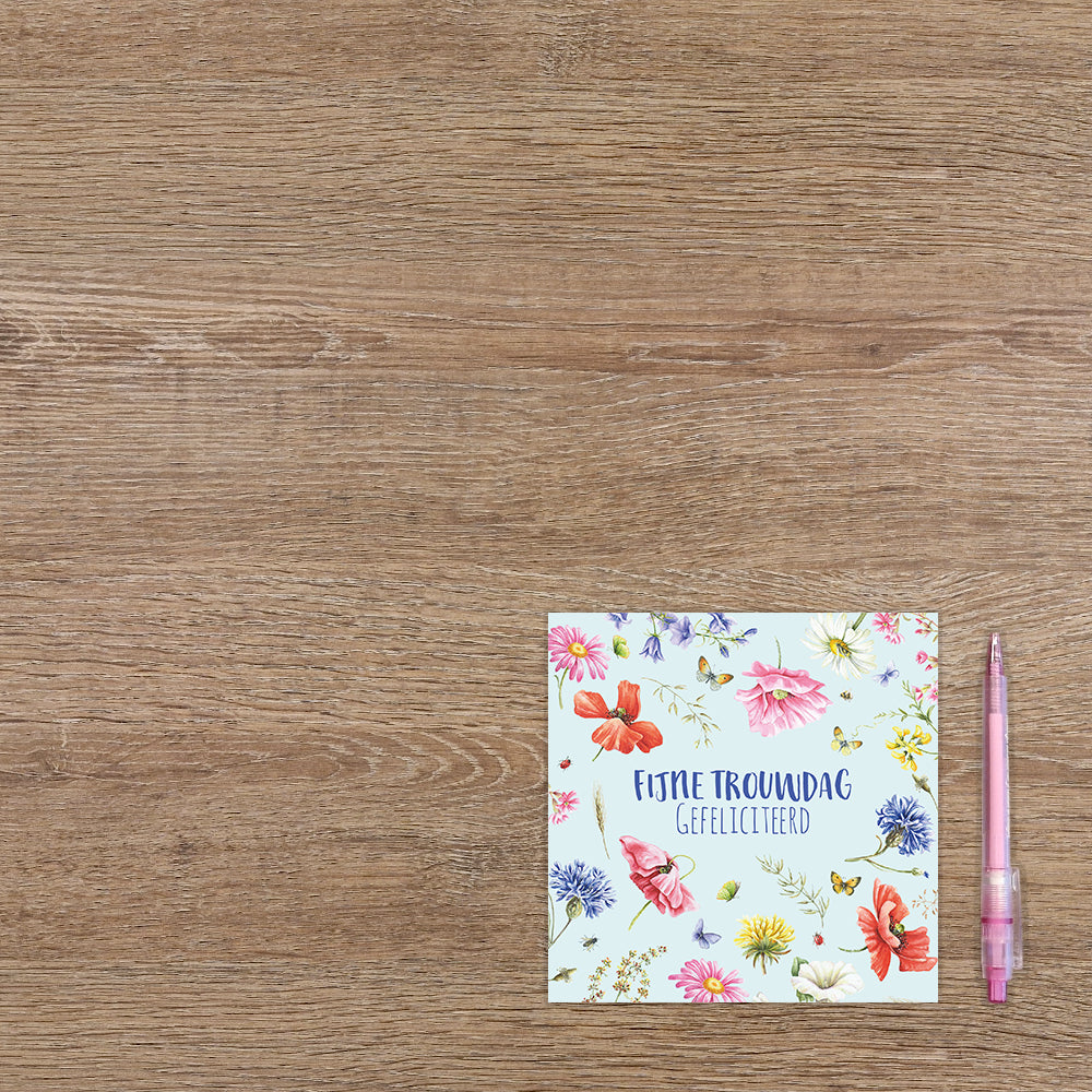 De wenskaart heeft een afmeting van x en een vierkante vorm. Op deze wenskaart staan bloemen in de kleuren paars, roze, rood, geel en wit met in het midden de tekst: "Fijne trouwdag gefeliciteerd". De binnenzijde van de wenskaart is blanco wat voldoende ruimte geeft om een persoonlijke boodschap te schrijven .