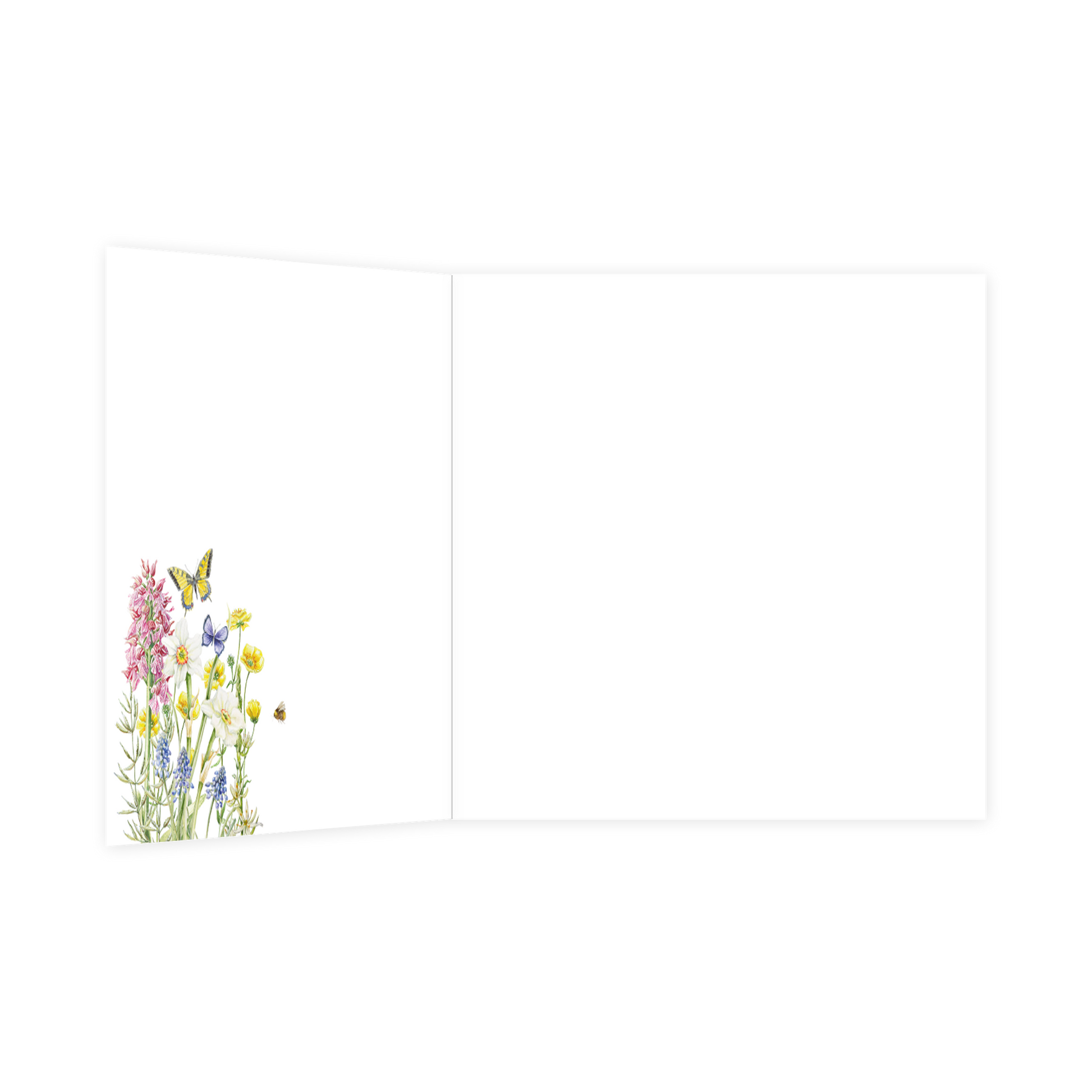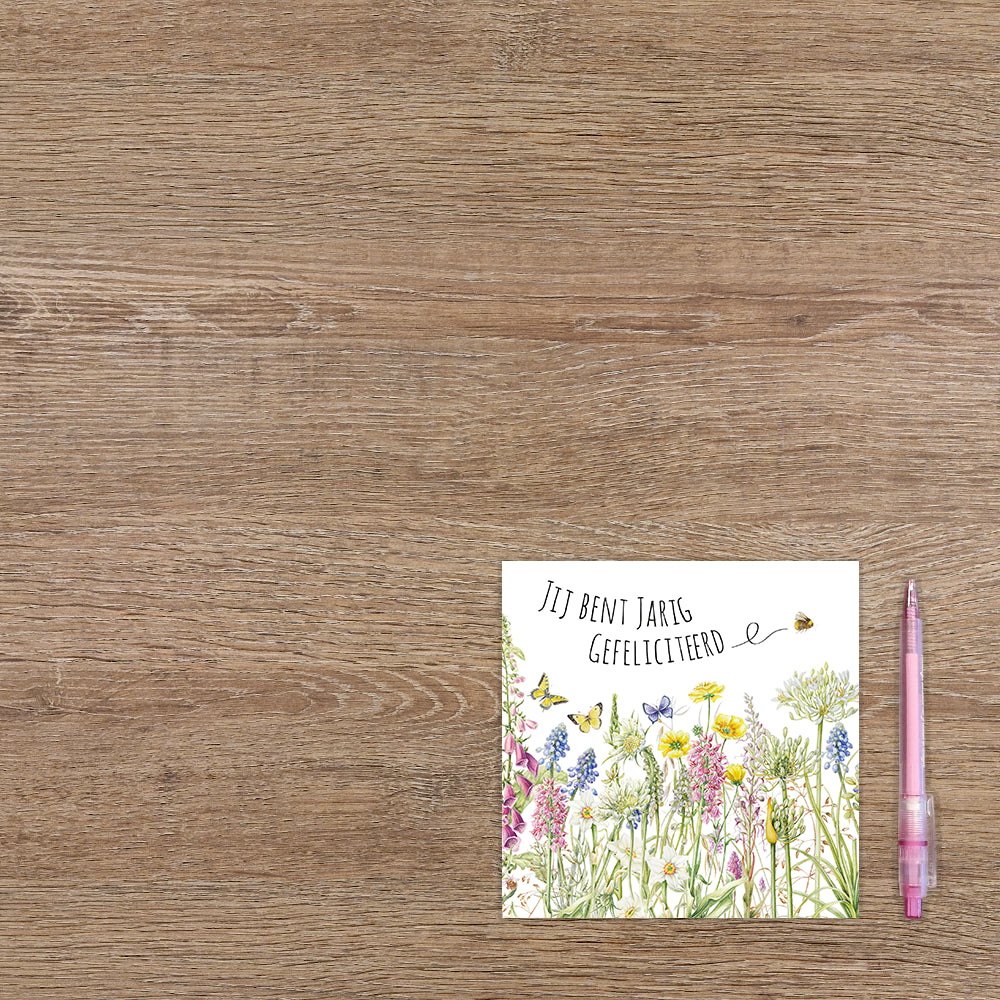 De wenskaart heeft een afmeting van x en een vierkante vorm. Op deze wenskaart staat een bloemenveld met vlinders en daarboven de tekst: "Jij bent jarig gefeliciteerd". De binnenzijde van de wenskaart is blanco wat voldoende ruimte geeft om een persoonlijke boodschap te schrijven .