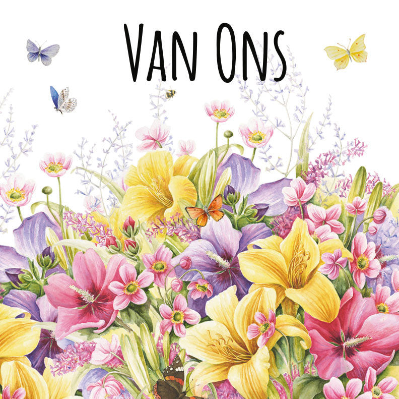 De wenskaart heeft een afmeting van x en een vierkante vorm. Op deze wenskaart staan bloemen in de kleuren geel, paars, roze en groen, met daarboven de tekst: "Van ons". De binnenzijde van de wenskaart is blanco wat voldoende ruimte geeft om een persoonlijke boodschap te schrijven .