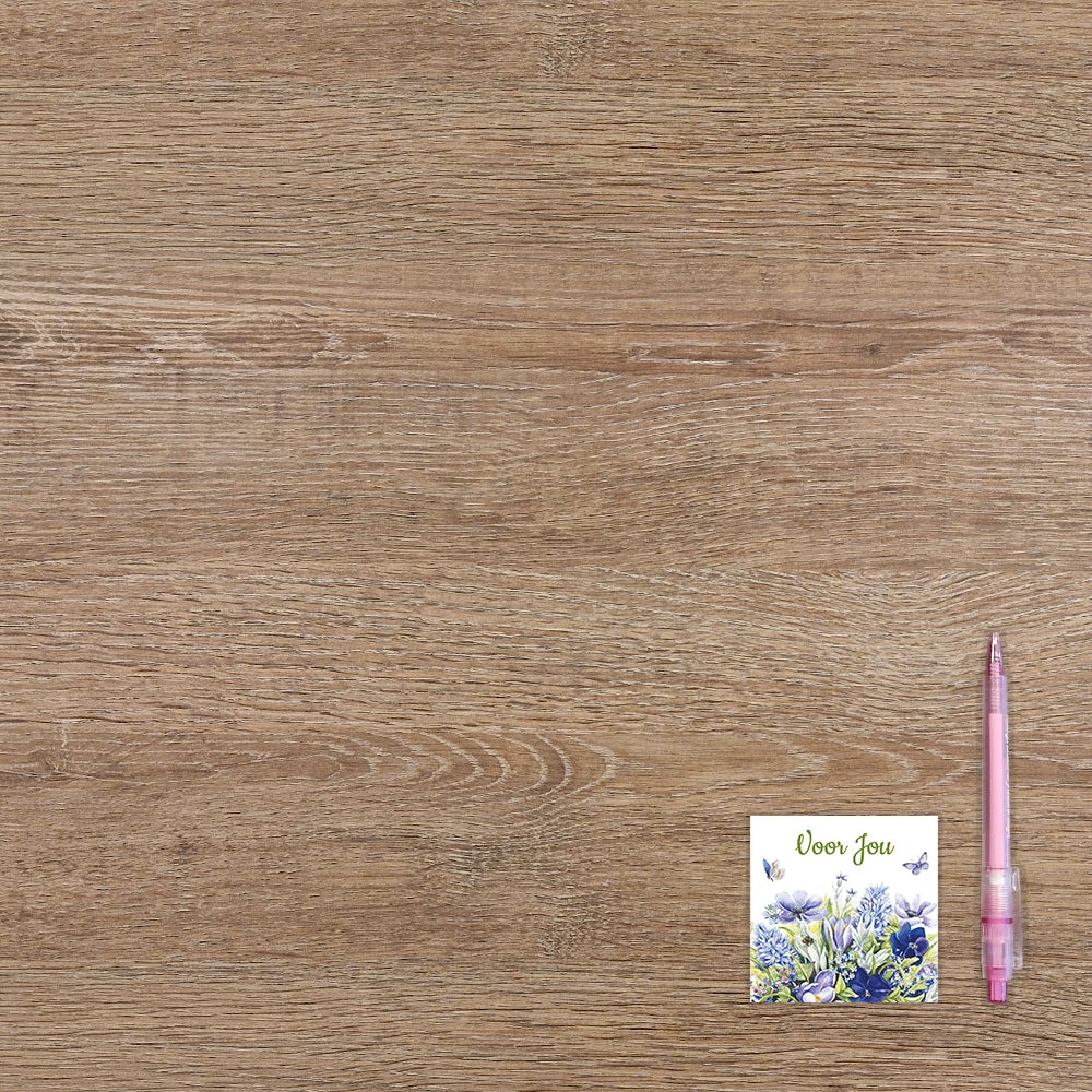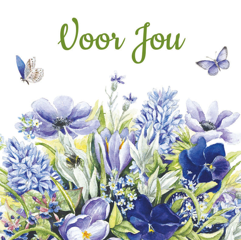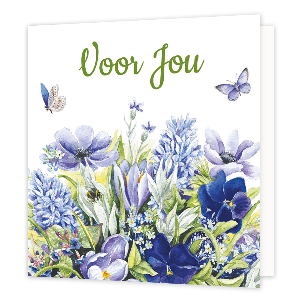 De wenskaart heeft een afmeting van x en een vierkante vorm. Op deze wenskaart staan bloemen in de kleuren blauw, paars en groen, met daarboven de tekst: "Voor jou". De binnenzijde van de wenskaart is blanco wat voldoende ruimte geeft om een persoonlijke boodschap te schrijven .