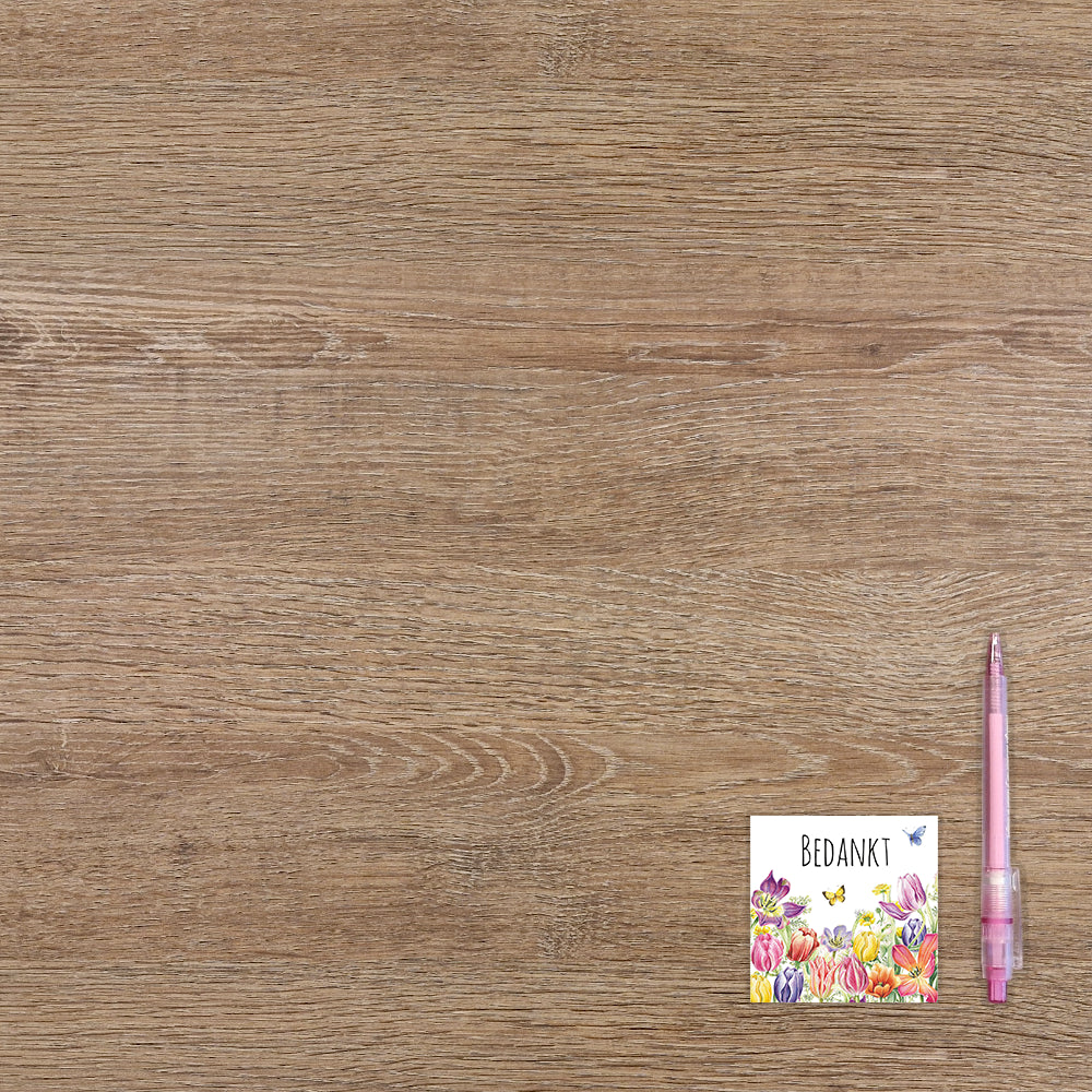 De wenskaart heeft een afmeting van x en een vierkante vorm. Op deze wenskaart staan bloemen in de kleuren rood, geel, paars, roze en groen, met daarboven de tekst: "Bedankt". De binnenzijde van de wenskaart is blanco wat voldoende ruimte geeft om een persoonlijke boodschap te schrijven .