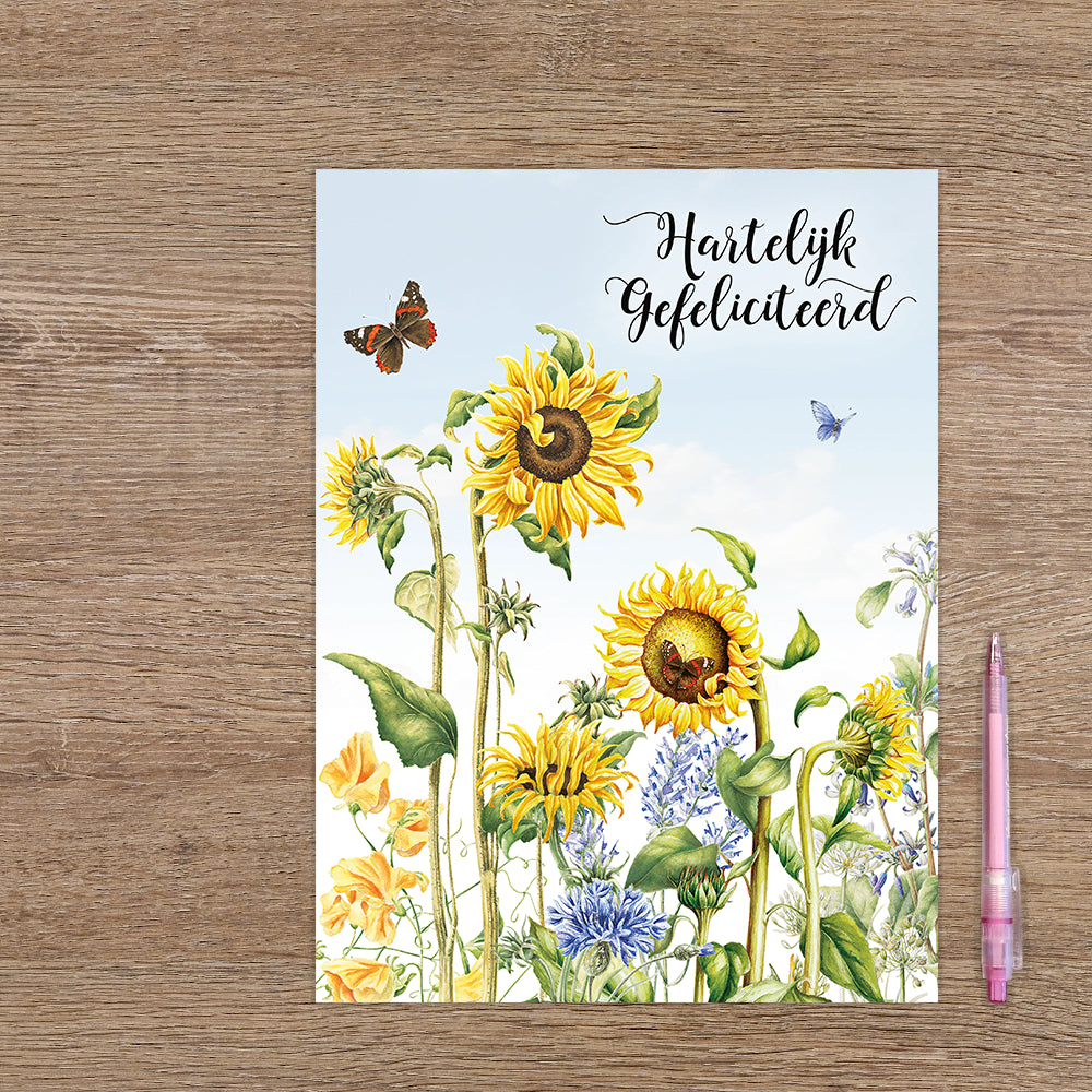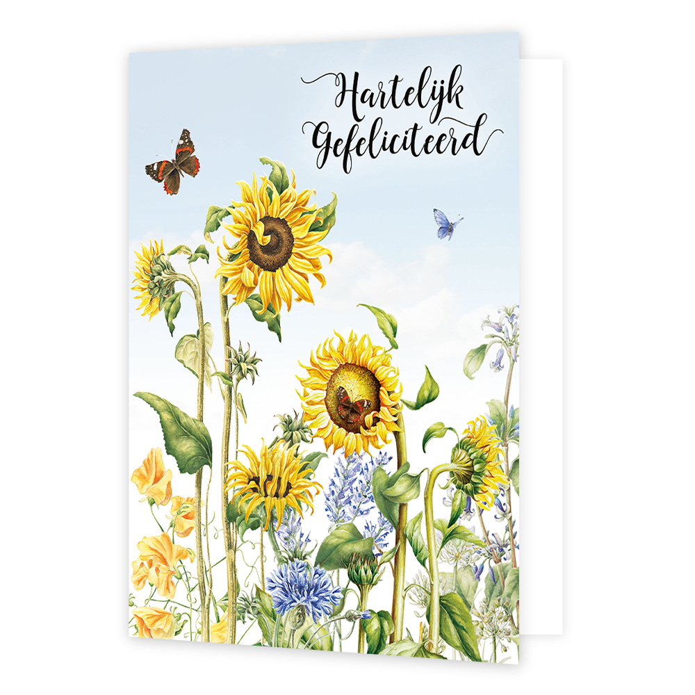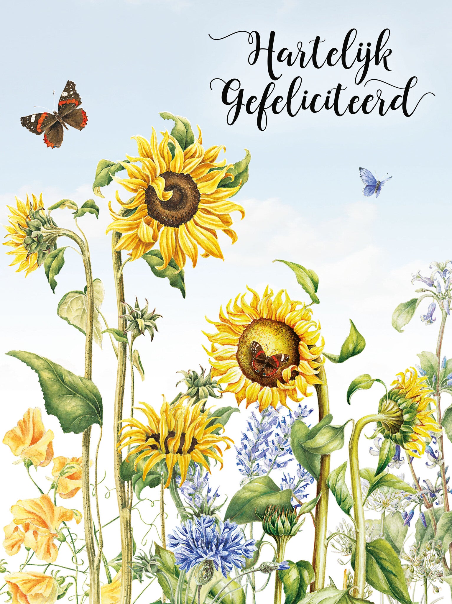 De wenskaart heeft een afmeting van x en een staande vorm. Op deze wenskaart staan zonnebloemen met vlinders en daarboven de tekst: "Hartelijk gefeliciteerd". De binnenzijde van de wenskaart is blanco wat voldoende ruimte geeft om een persoonlijke boodschap te schrijven .