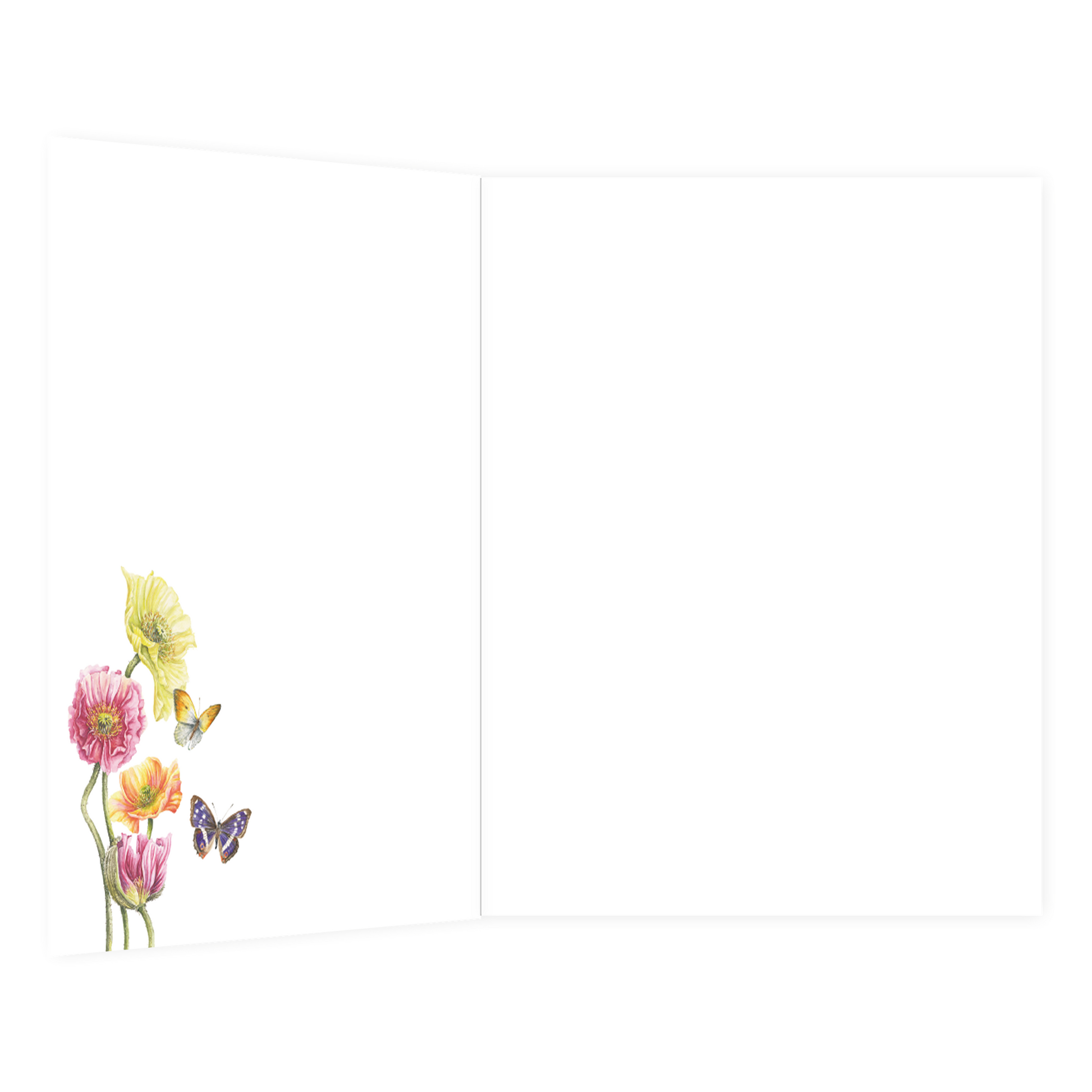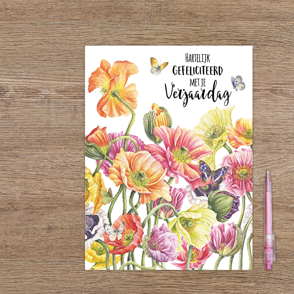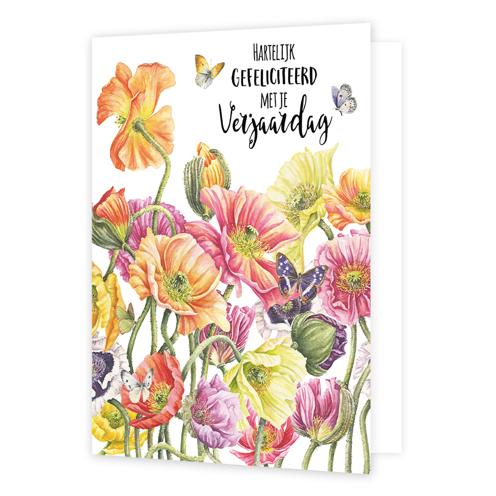 De wenskaart heeft een afmeting van x en een staande vorm. Op deze wenskaart staan bloemen in de kleuren oranje, paars, roze en geel, met vlinders en de tekst: "Hartelijk gefeliciteerd met je verjaardag". De binnenzijde van de wenskaart is blanco wat voldoende ruimte geeft om een persoonlijke boodschap te schrijven .