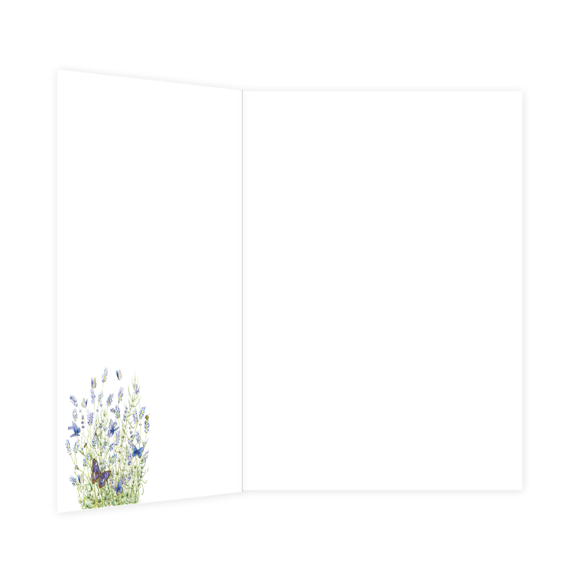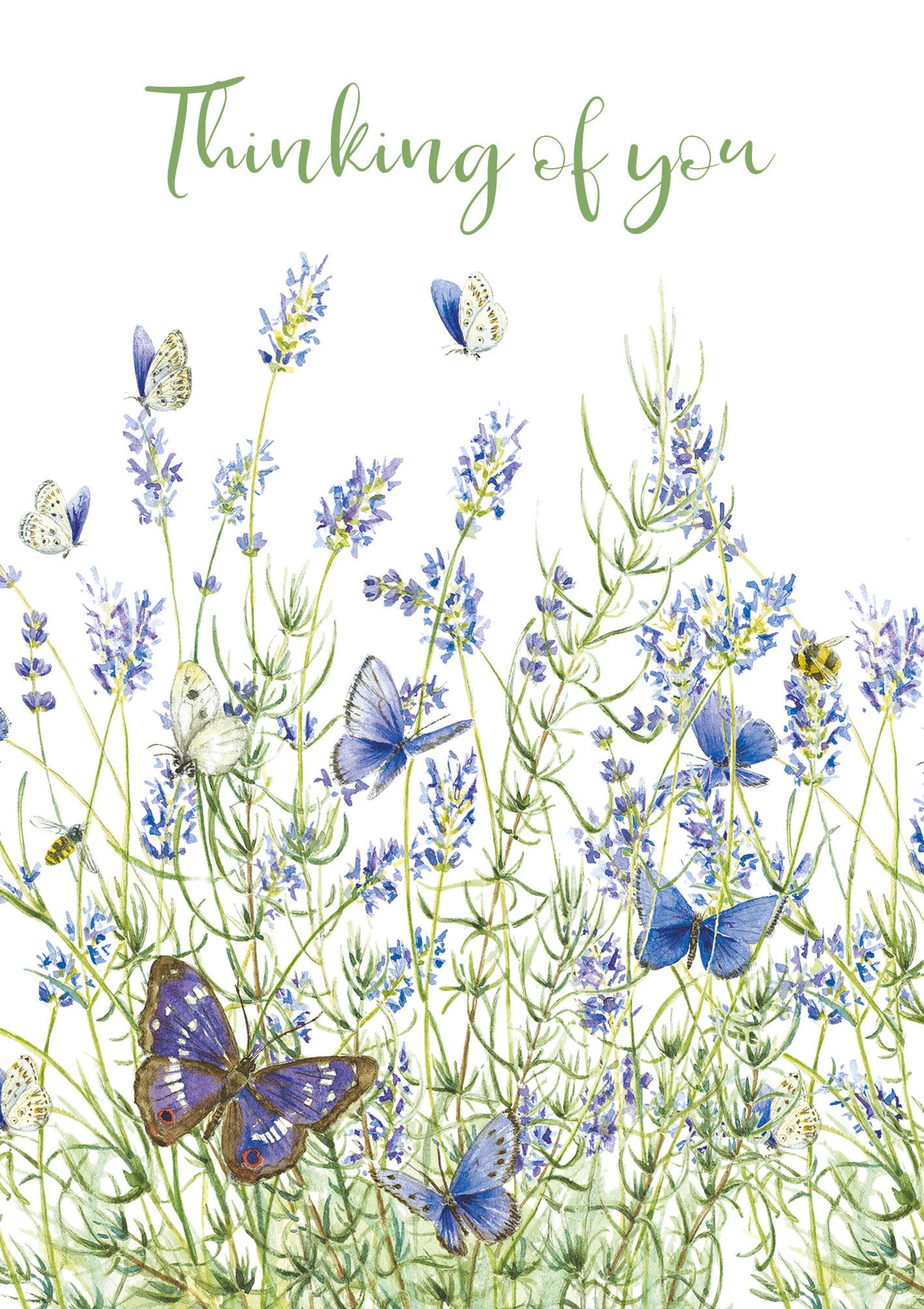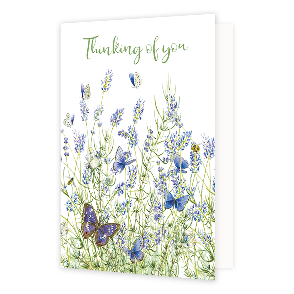 De wenskaart heeft een afmeting van x en een staande vorm. Op deze wenskaart staan bloemen en vlinders in de kleuren blauw en groen, met daarboven de tekst: "Thinking of you". De binnenzijde van de wenskaart is blanco wat voldoende ruimte geeft om een persoonlijke boodschap te schrijven .
