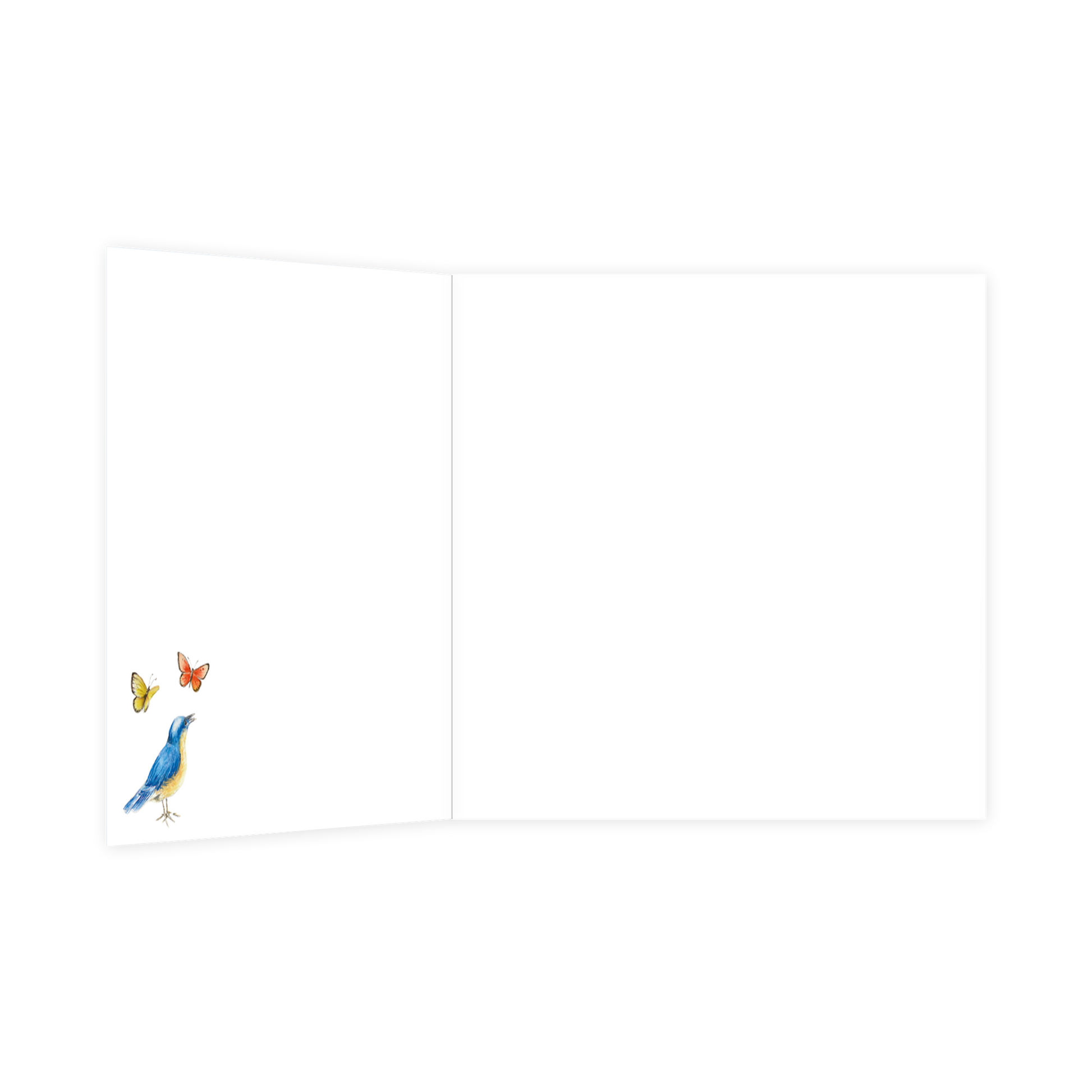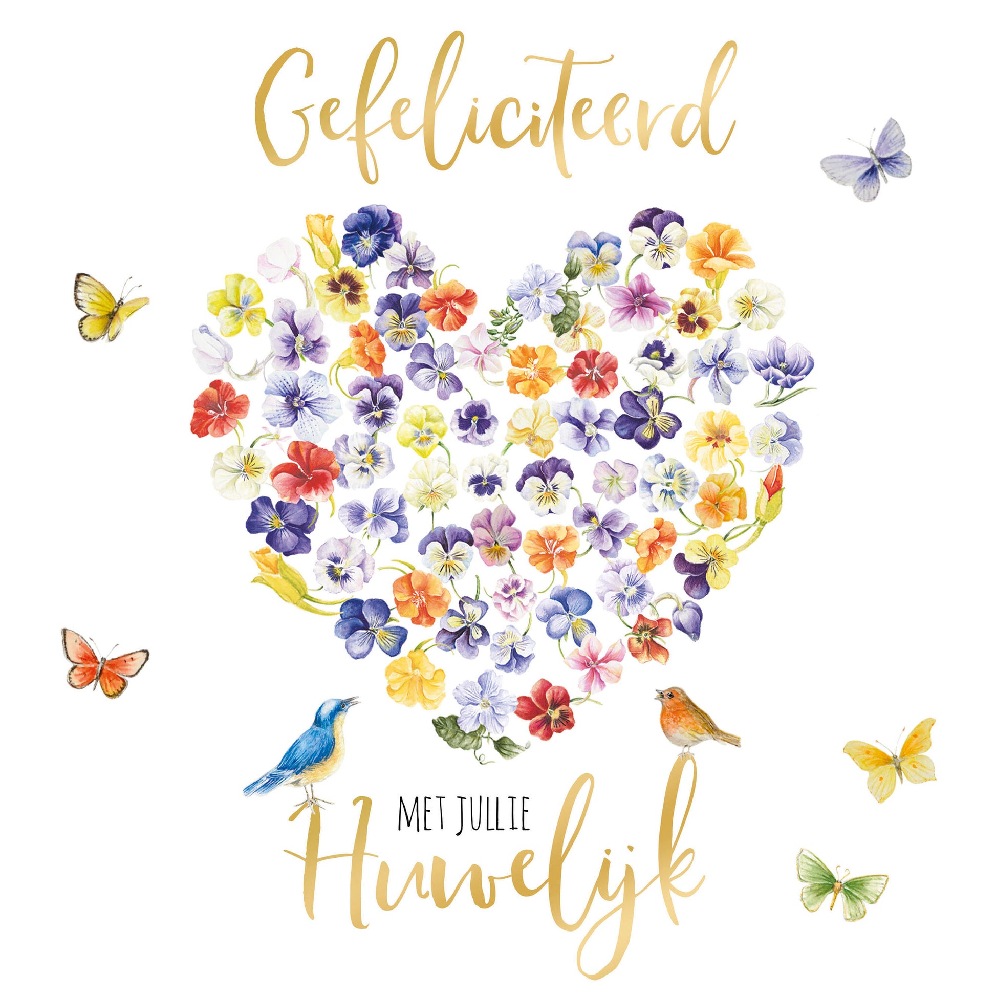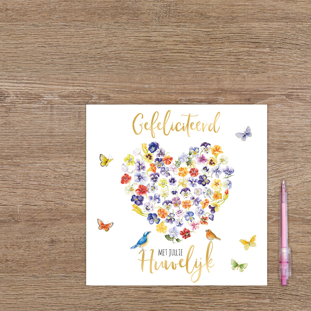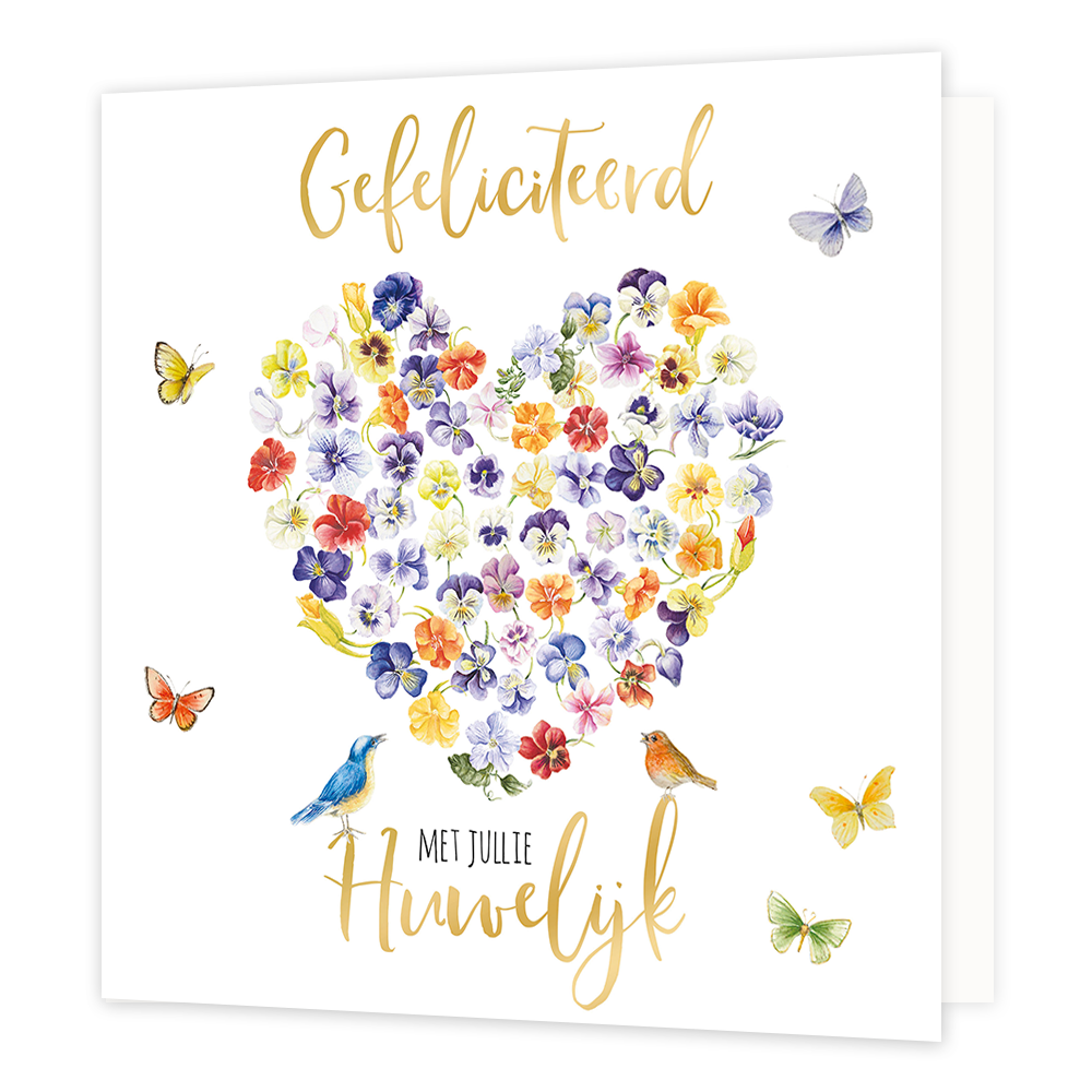 De wenskaart heeft een afmeting van x en een vierkante vorm. Op deze wenskaart staat een hart gemaakt van bloemen, omringt door vlinders en vogels. In de illustratie staat de tekst: "Gefelicteerd met jullie huwelijk". De binnenzijde van de wenskaart is blanco wat voldoende ruimte geeft om een persoonlijke boodschap te schrijven .