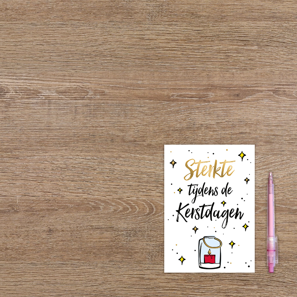 De wenskaart heeft een afmeting van x en een staande vorm. Op deze kerstkaart staat een kaars met daarboven de tekst: "Sterkte tijdens de kerstdagen". De binnenzijde van de wenskaart is blanco wat voldoende ruimte geeft om een persoonlijke boodschap te schrijven .