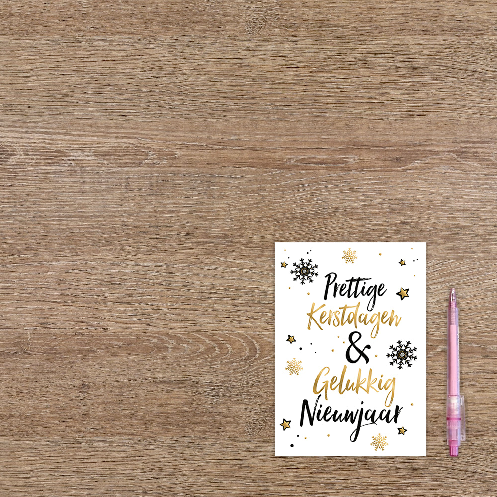 De wenskaart heeft een afmeting van x en een staande vorm. Op deze kerstkaart staan sterren en sneeuwvlokjes met in het midden de tekst: "Prettige kerstdagen & gelukkig nieuwjaar". De binnenzijde van de wenskaart is blanco wat voldoende ruimte geeft om een persoonlijke boodschap te schrijven .
