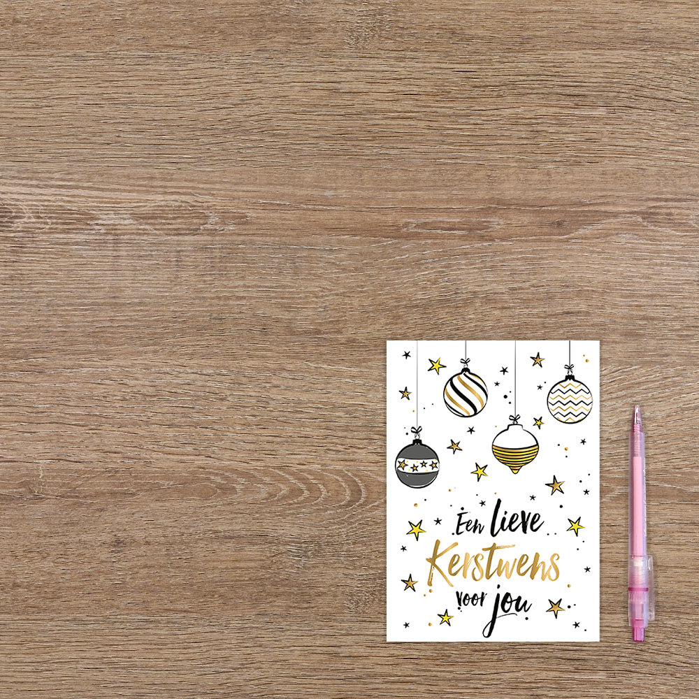 De wenskaart heeft een afmeting van x en een staande vorm. Op deze kerstkaart staan kerstballen en sterren met daaronder de tekst: "Een lieve kerstwens voor jou". De binnenzijde van de wenskaart is blanco wat voldoende ruimte geeft om een persoonlijke boodschap te schrijven .
