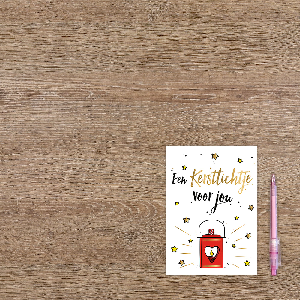 De wenskaart heeft een afmeting van x en een staande vorm. Op deze kerstkaart staat een lantaarn omringt door sterren en daarboven de tekst: "Een kerstlichtje voor jou". De binnenzijde van de wenskaart is blanco wat voldoende ruimte geeft om een persoonlijke boodschap te schrijven .