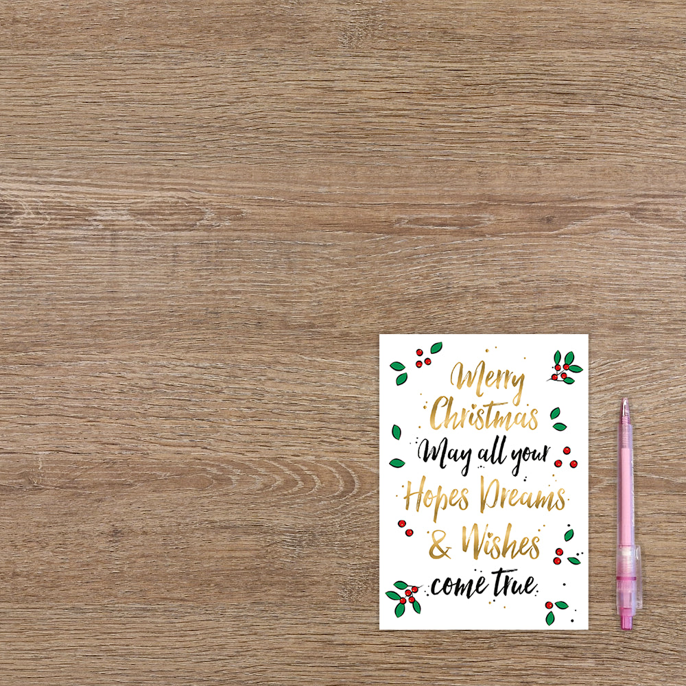 De wenskaart heeft een afmeting van x en een staande vorm. Op deze kerstkaart staan groene blaadjes met rode besjes en de tekst: "Merry christmas may all your hopes dreams & wishes come true". De binnenzijde van de wenskaart is blanco wat voldoende ruimte geeft om een persoonlijke boodschap te schrijven .